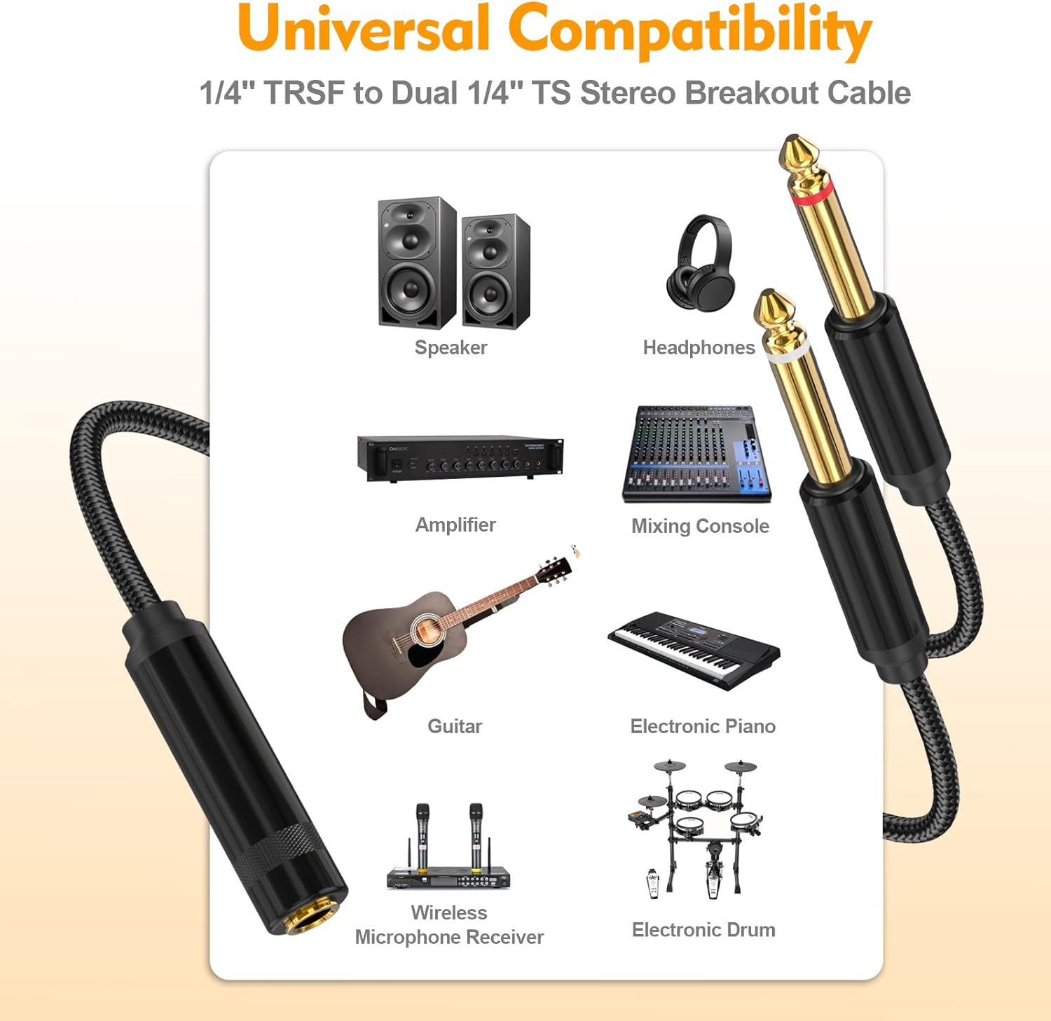 - EASILY CONNECT DEVICES: HOSONGIN 1/4 inch TRS Stereo Female to Dual 1/4 inch Y-Splitter Cable uses a 1/4" TRS stereo cable to connects a Mixer, Amplifier, Headphones, Speaker, or other devices with 6.35mm 1/4" TRS output to Hi-Fi stereo, speakers, or other pro audio gear with Dual 2x 6.35mm 1/4" TS Mono jack Stereo inputs.