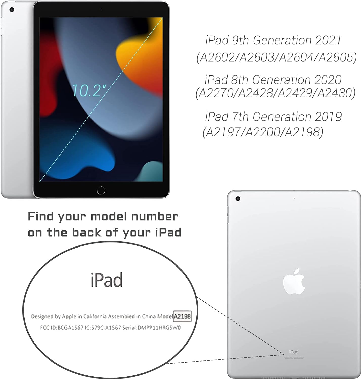 - 【Compatibility】Only for iPad 10.2 inch 9th Generation (2021 Release), iPad 8th Generation (2020 Release), iPad 7th Generation (2019 Release). Model number: A2602 / A2603/ A2604/ A2605 /A2270 /A2428 /A2429 /A2430 /A2197 /A2198 /A2200. Please check back bottom of your iPad case to find the model number.
