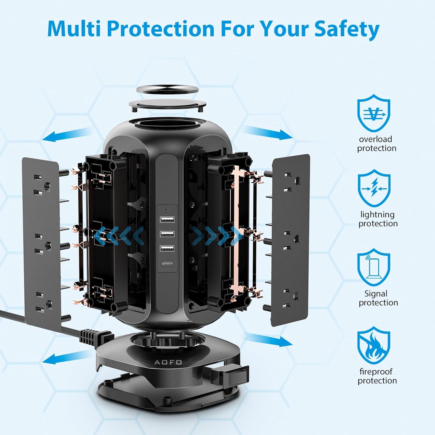 - Space-saving unique tower design: AOFO charging station adopts a unique vertical design, and the top adopts a delicate CD pattern design, so that your power strip are not monotonous, and you do not need to worry about the large plugs blocking each other, which helps you save space and is beautiful . Choose this office supply to keep your desktop clean and beautiful.