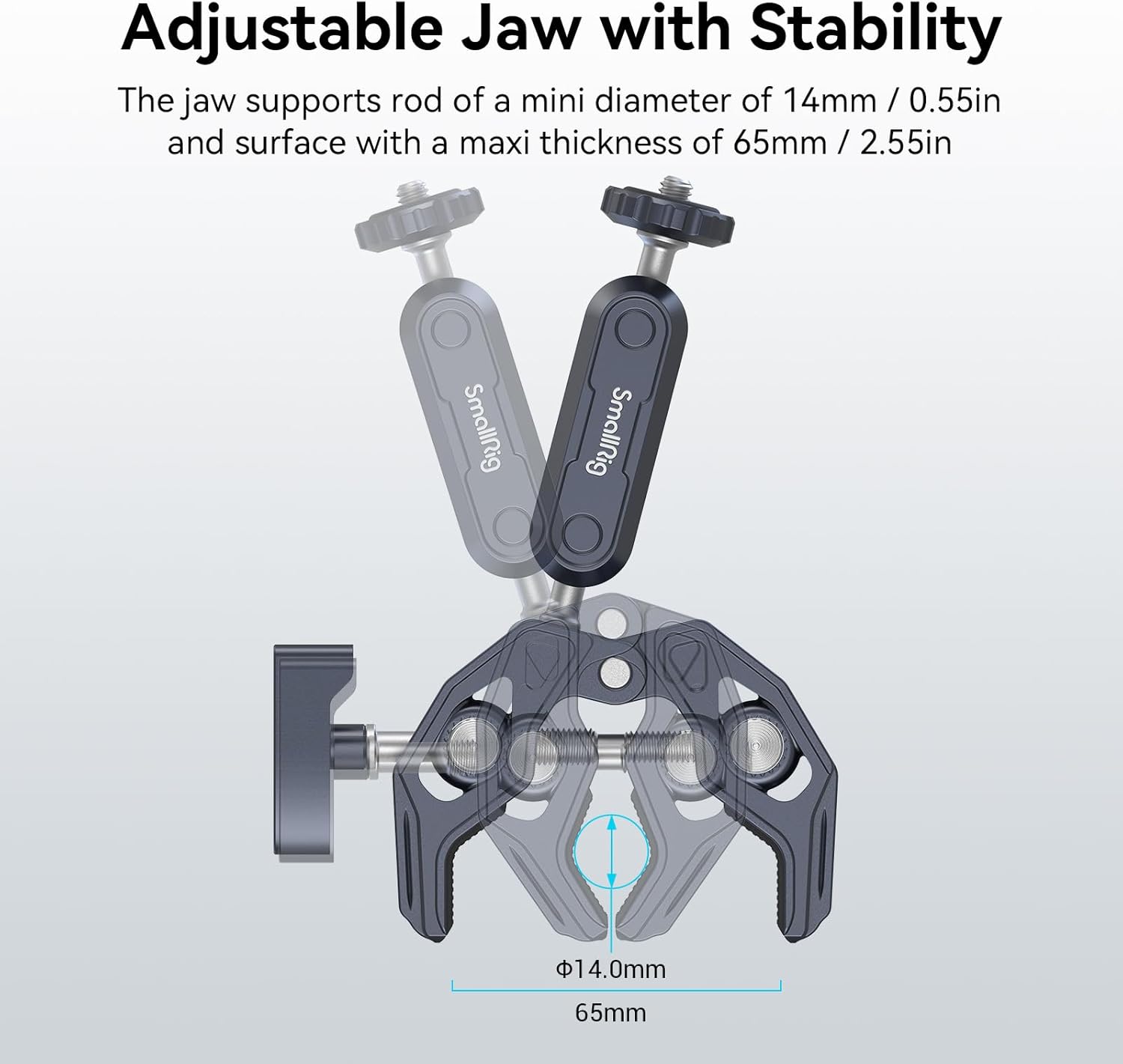 - Adjustable Jaw: It supports rod of a diameter of 0.55inch(14mm) to 2.36inch(60mm), and a surface with a maximum thickness of up to 2.55inch(65mm) for you to fix on round pipes, tables, handlebars, tripods, and stabilizer handheld rings.