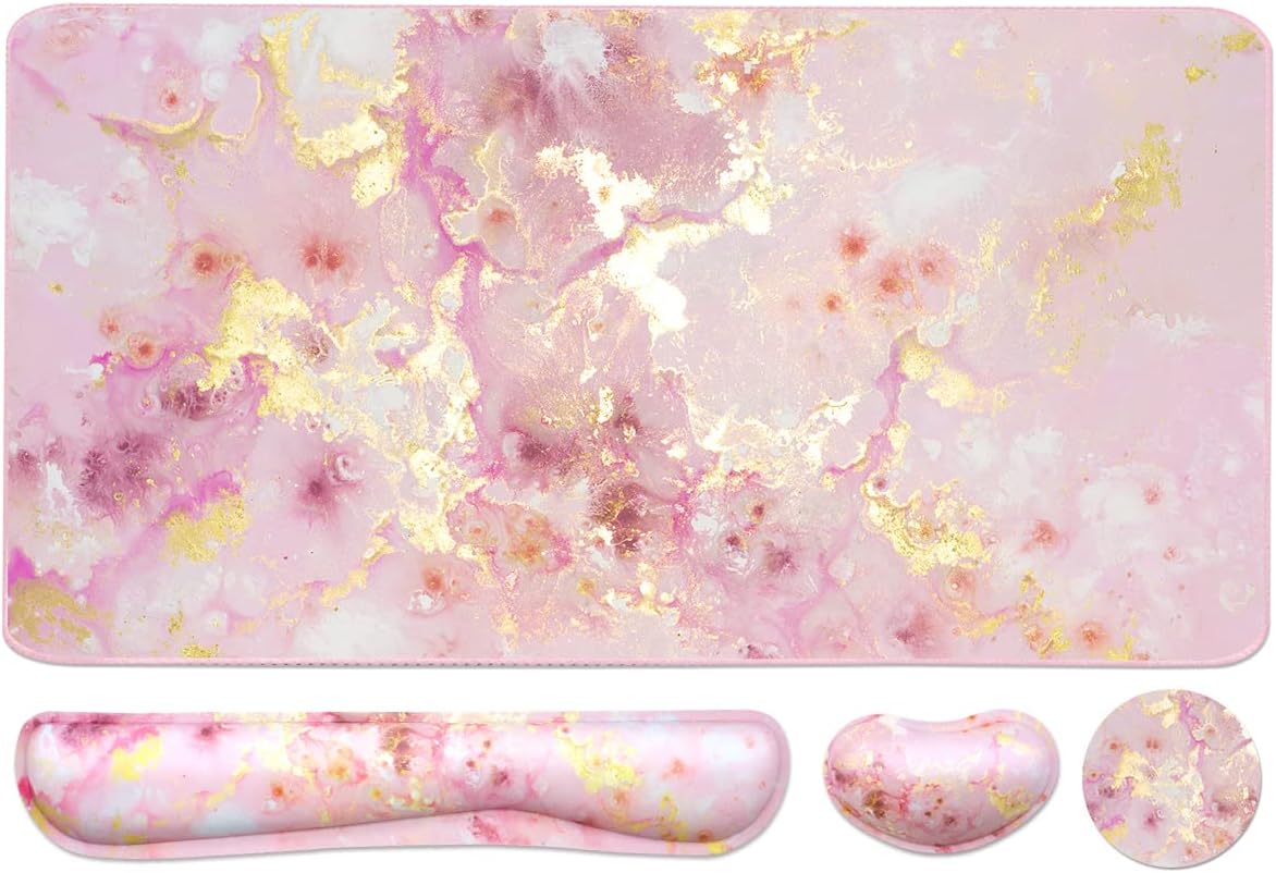 Keyboard Mouse Pad Set, Extended Mouse Pad+Keyboard Wrist Rest Support, Memory Foam Ergonomic Easy Typing, 3Pcs (35.4×15.7 in) Desk Pad Set for Home Office Study Game- Pink Gold Marble