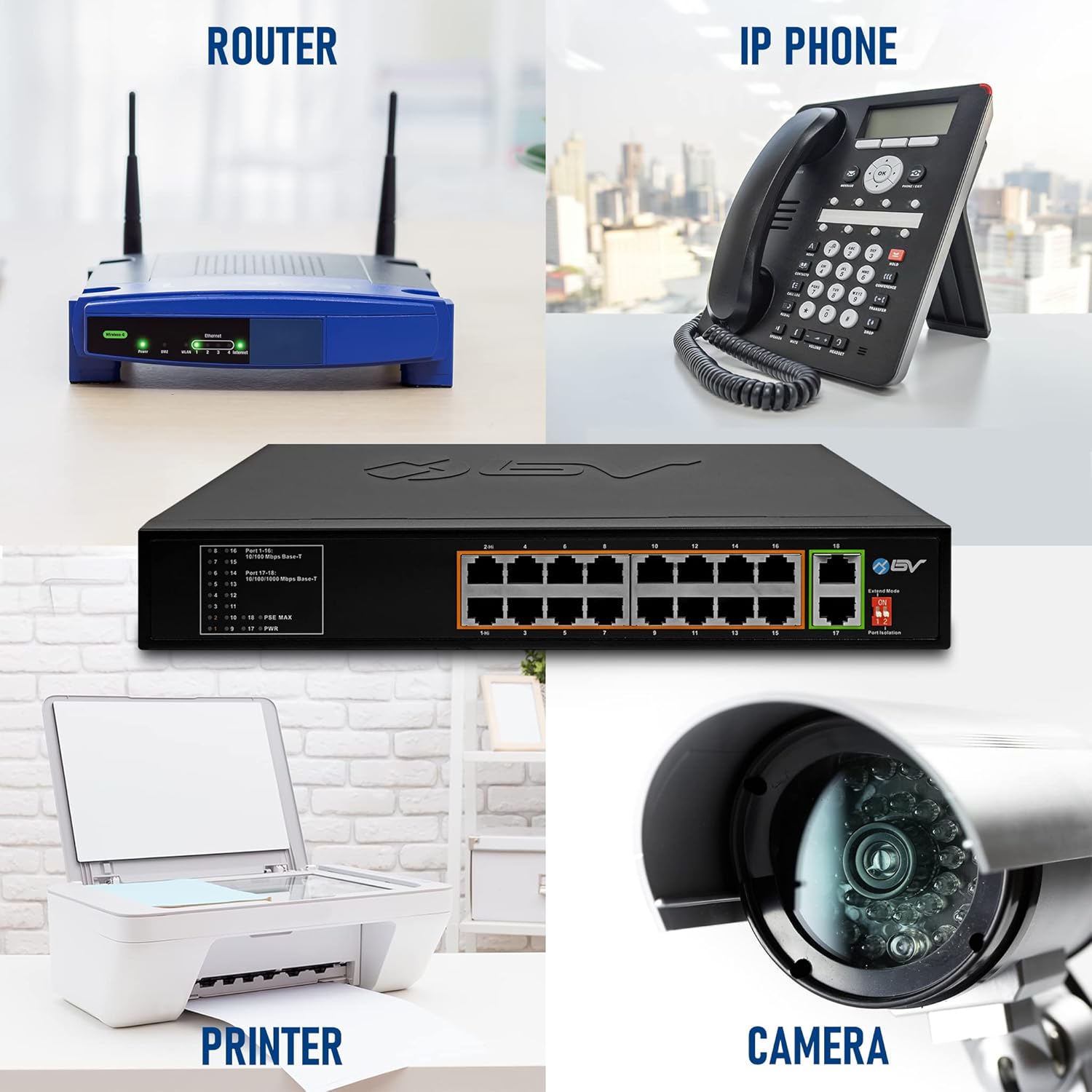 - [Maximize your network capabilities]: 16 PoE+ Ports at 10/100Mbps each, 2 Gigabit Ethernet Uplink Ports at 10/100/1000Mbps each, allowing you to connect and power up to 16 devices at once.