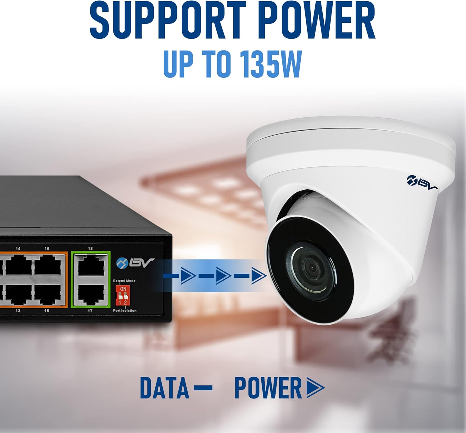 - [High power output]: The 135W power budget ensures that even high-power devices such as IP cameras and wireless access points can be powered and connected.135W Max Power (up to 30W per port), Hi-PoE at port 1&2 providing up to 60W single port, 6kV surge protection