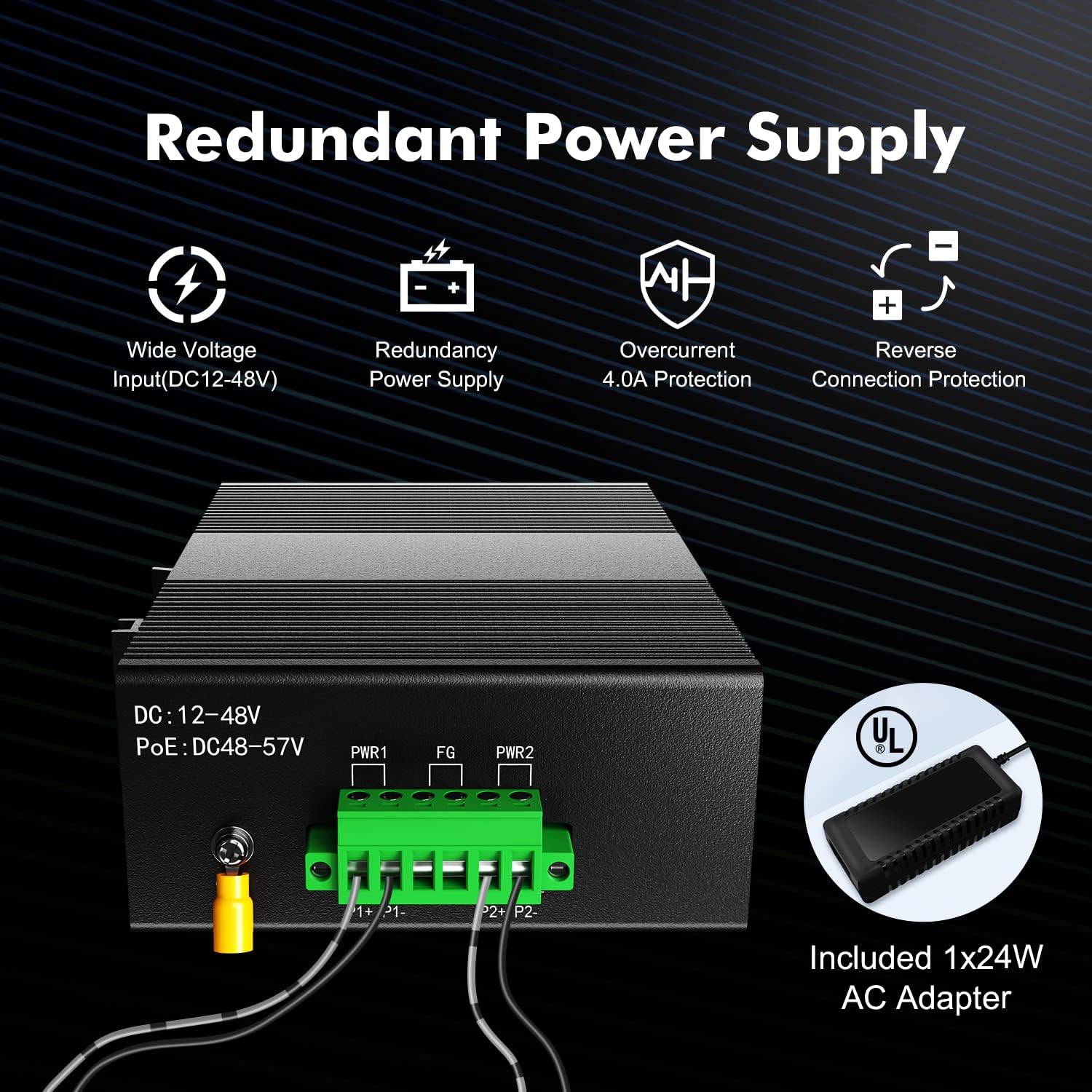 - Dual power supply, automatic fault switching, anti-reverse connection does not damage the equipment, higher reliability, equipped with one UL-certified power adapter, can be used without additional purchase