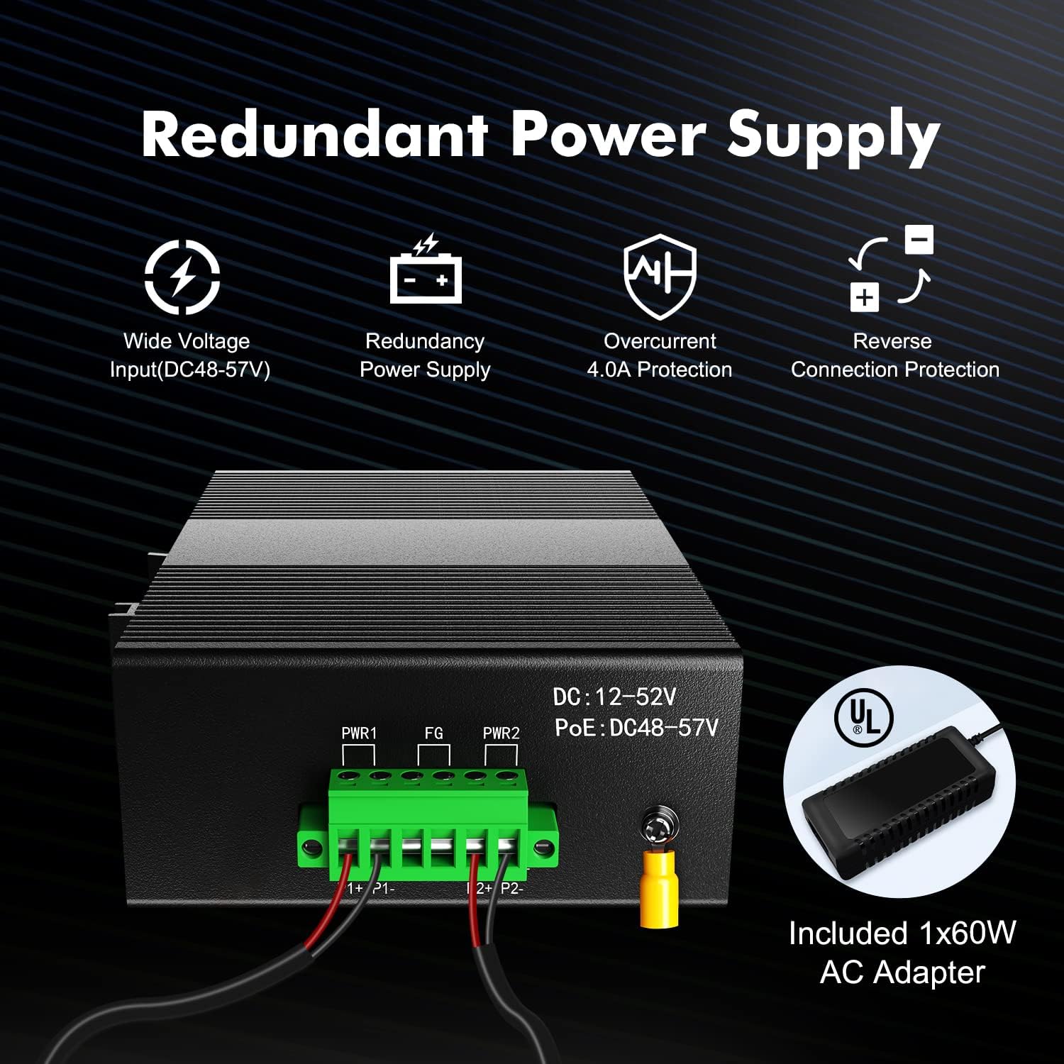 - Dual power supply, automatic fault switching, anti-reverse connection does not damage the equipment, higher reliability, equipped with one UL-certified power adapter, can be used without additional purchase