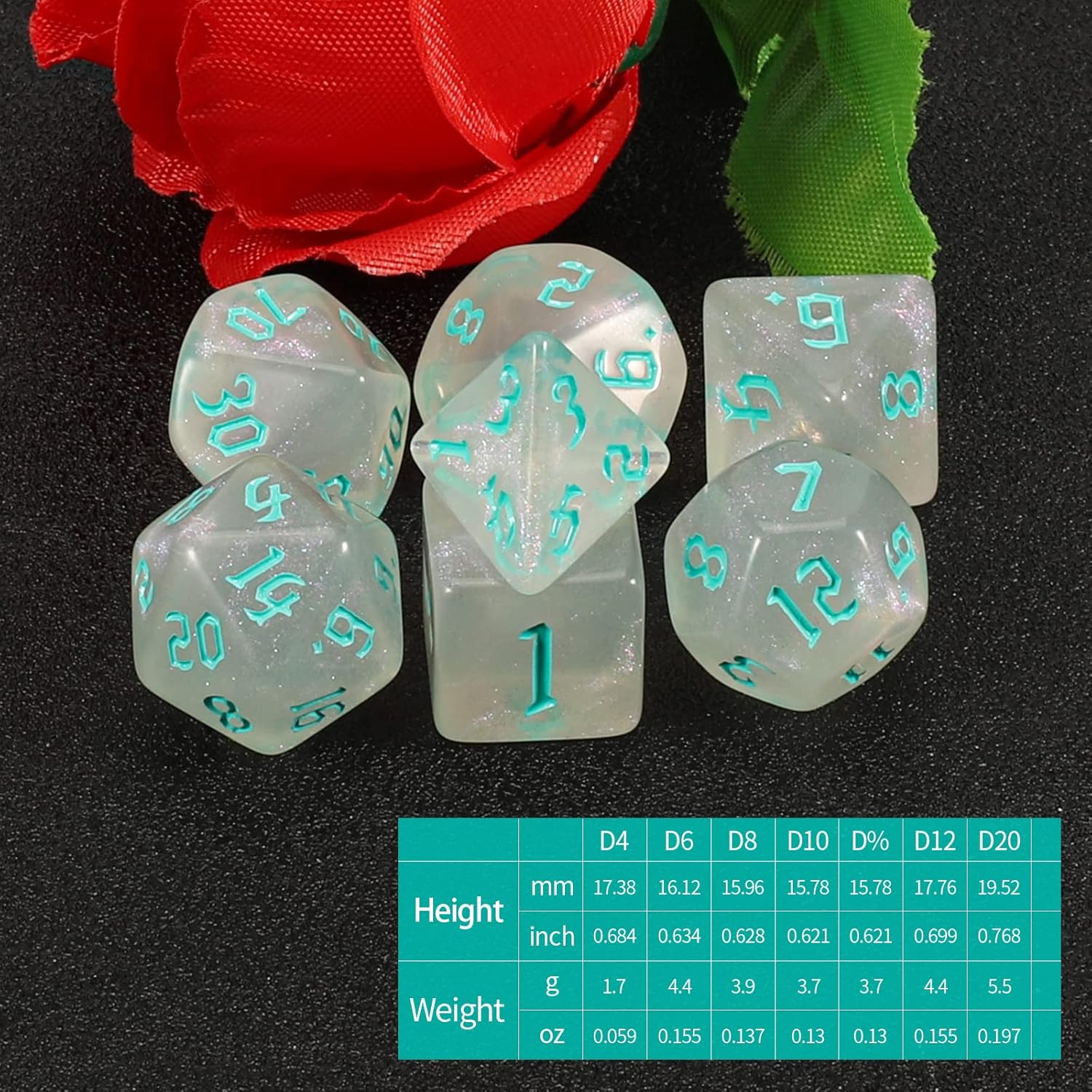 QMAY DND Dice Set -D&D Polyhedral Dice (7 Pcs) for Dungeons and Dragons (Transparent White Glitter)