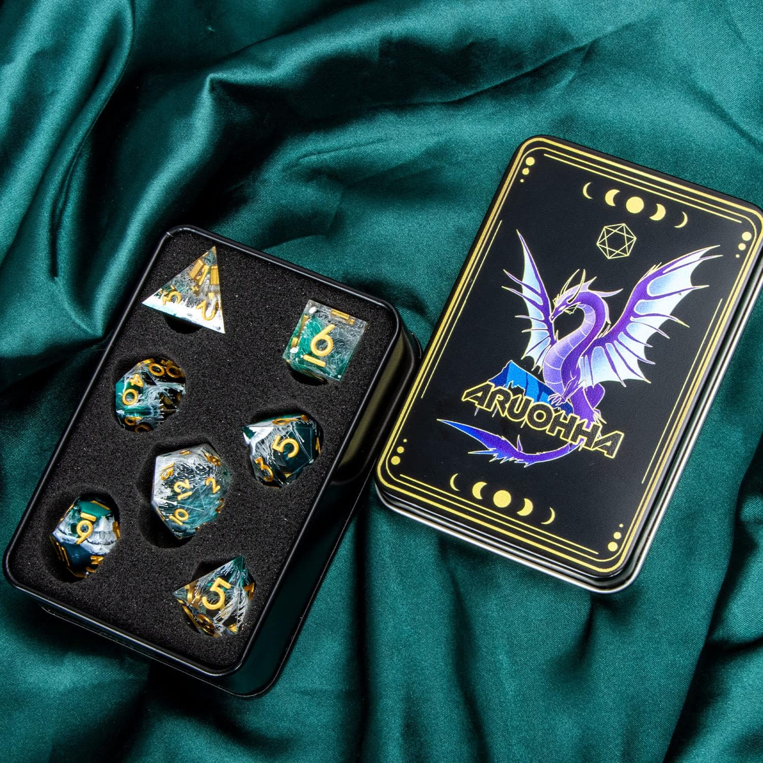 ARUOHHA Sharp Edge Dice DND Resin Translucent Dice Set, Green Handmade D and D Dice Set RPG Role Playing Games Polyhedral Dice D20 D12 D10 D8 D6 D4