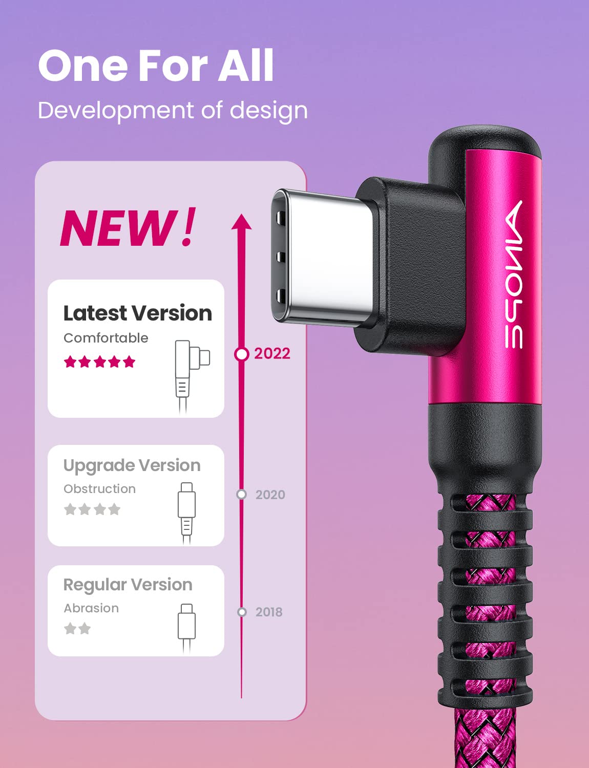- [Never Bended Cable When Charging] USB C Cable has electronic safety certifications that comply with appropriate standards, it built-in laser welding technology, which ensure the metal part won't break. The longer SR anti-break design enhances the durability of the cable. With 40,000+ times bend test, the flexible and resistant double-braided nylon right angle type c cable longer service life and will never bended and rupture.