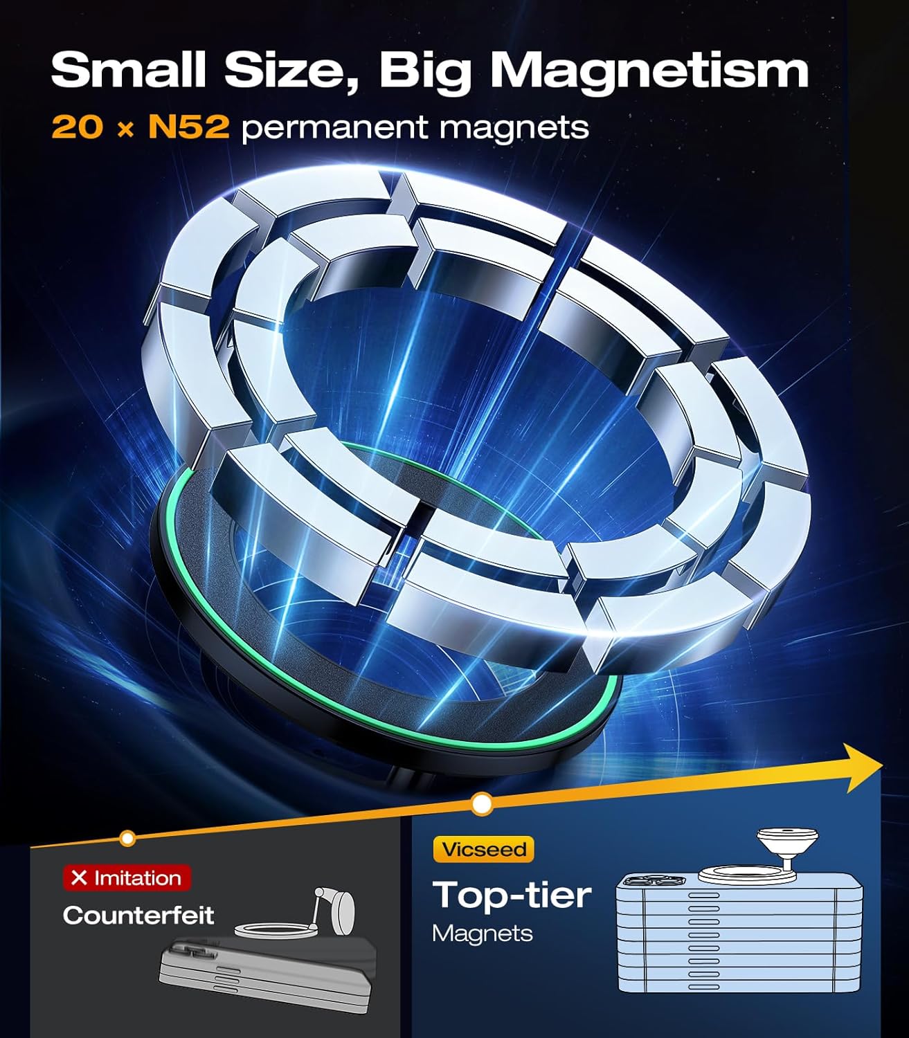 - [Unrivaled Magnetism, True Zero Drops] - This magnetic phone holder for car features top-tier N52 permanent magnets — just 2 magnets can secure 1 phone. Equipped with 20 magnets, our phone mount for car has far more magnetic power than any car holder on the market, not weaken with temp or time. Even during bumpy rides resembling a roller coaster, your phone will never fall off and distract you. Annular closed magnetic field, not interfere with the signal or battery drain. Vicseed means safe