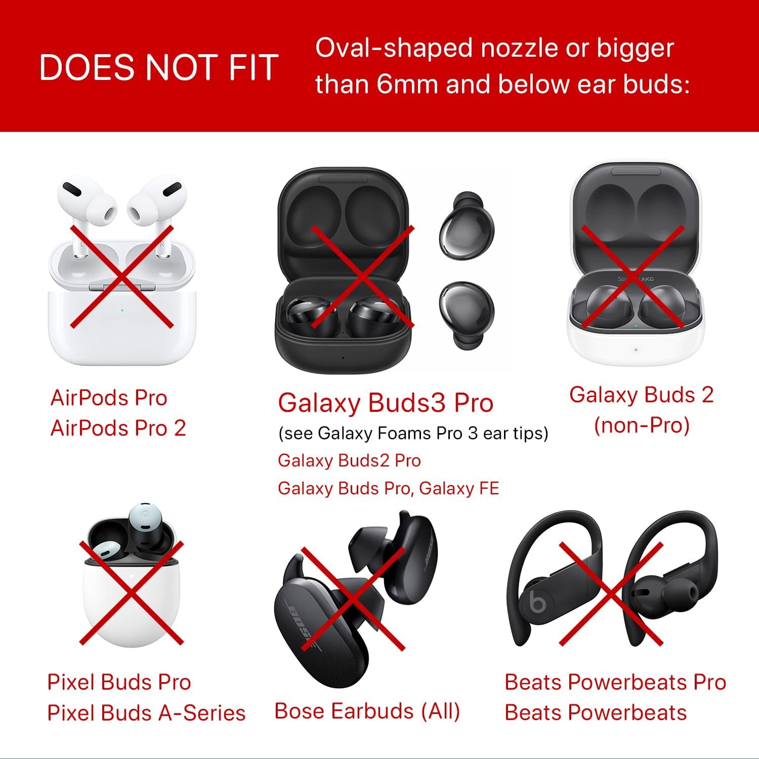 - DOES NOT FIT AirPods Pro 1/2, Galaxy Buds3Pro, Galaxy Buds2 Pro, Galaxy Buds Pro, Galaxy Buds 2 (non-Pro), Pixel Buds Pro, All Bose earbuds, Beats Powerbeats 1.