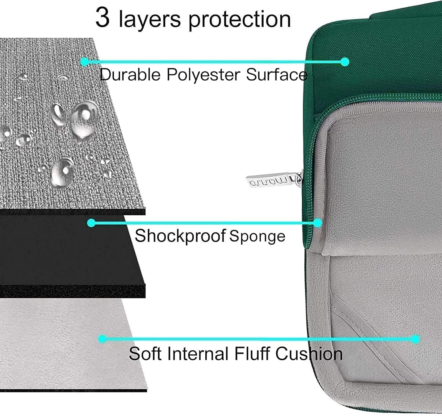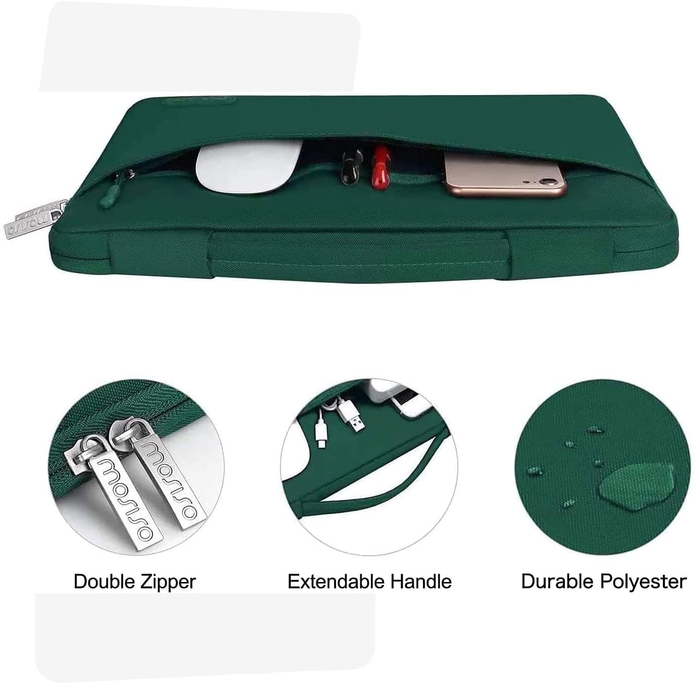 - The 360 degree protective shockproof laptop sleeve with handle carrying bag internal dimension: 13.39 x 9.25 x 0.79 inches (L x W x H); external dimension: 13.98 x 9.84 x 0.79 inches (L x W x H). The front side pocket dimension: 11.61 x 9.25 inches (L x W). Made of polyester material, protect your laptop against accidental spills. Slim and lightweight, does not bulk your device up and can easily slide into your briefcase, backpack or other bag. Ideal for business, daily and travel.