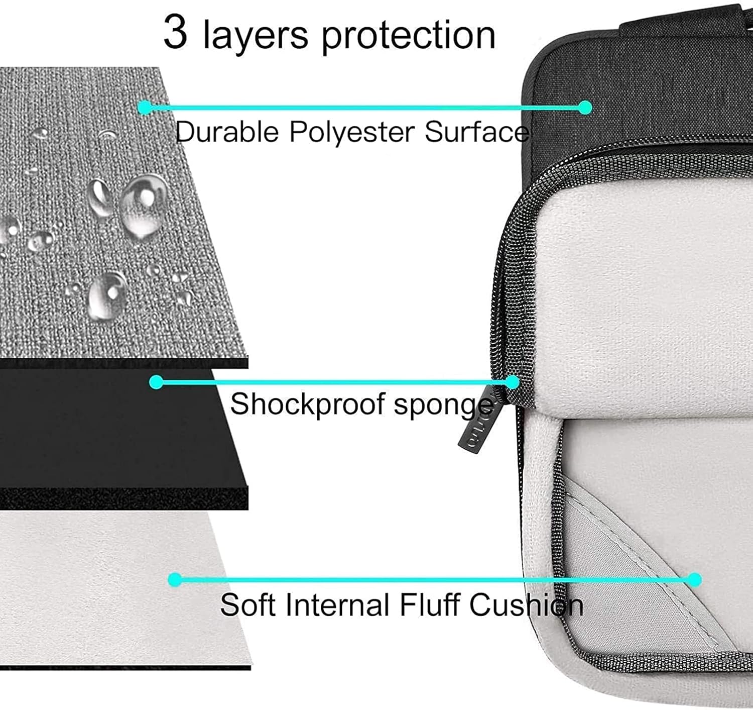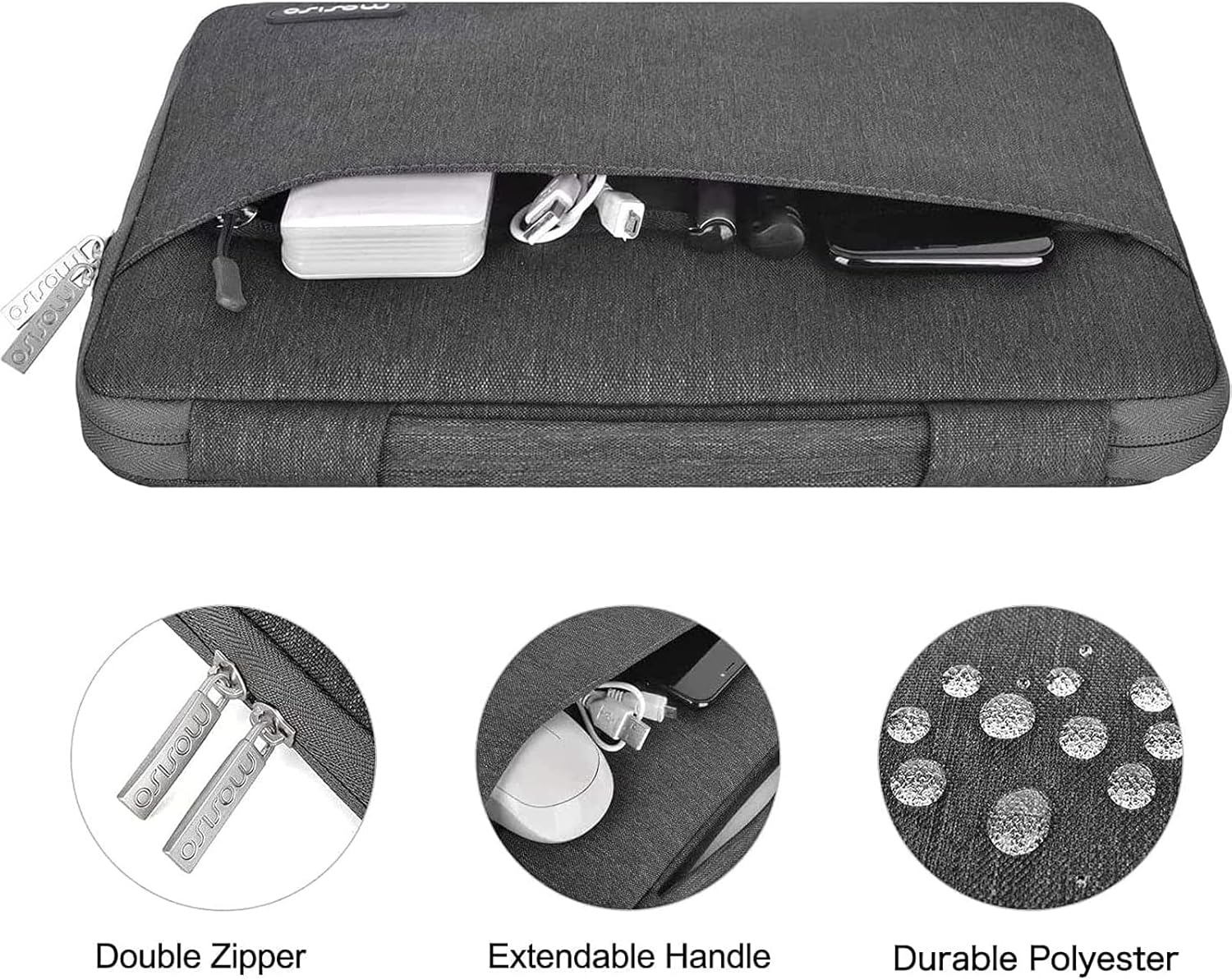 - The 360 degree protective shockproof laptop sleeve with handle carrying bag internal dimension: 13.39 x 9.25 x 0.79 inches (L x W x H); external dimension: 13.98 x 9.84 x 0.79 inches (L x W x H). The front side pocket dimension: 11.61 x 9.25 inches (L x W). Made of polyester material, protect your laptop against accidental spills. Slim and lightweight, does not bulk your device up and can easily slide into your briefcase, backpack or other bag. Ideal for business, daily and travel.