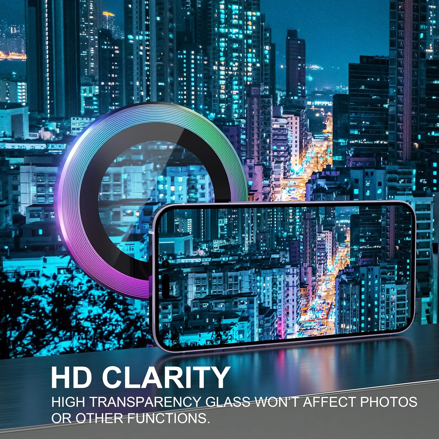 - Personalized Decoration: Made of high-quality aviation aluminum metal ring and 9H tempered glass. The delicate and precise CD texture spiral pattern gives your iPhone 14 Pro/Pro Max camera lens a new appearance. The multicolor lens protector ring matches your style.