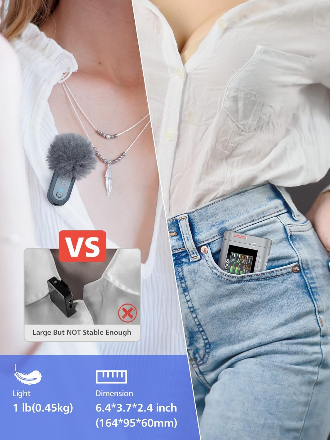 - ăPortable with 13 hours recording timeăThe transmitter weighs just 15 grams and clips easily onto a shirt. The receiver doubles as a charging case, ensuring the transmitter is fully charged within 2 hours, providing up to 13 hours of recording time.