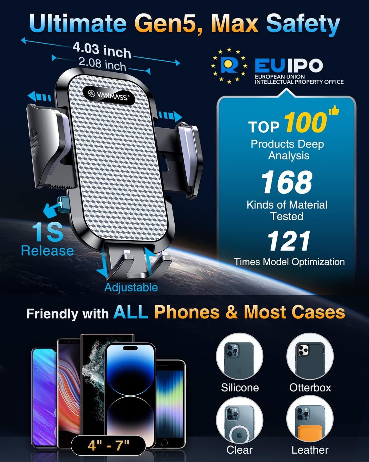 - ăHigh-end = Quality Materials + Grandmaster DesignăVANMASS car phone mount made of PC+ABS material has passed 4 environmental reliability tests and has a temperature resistance range of -40â to 194â, it is also highly resistant to UV rays (Ensuring reliability even in the sun), and the telescopic pole uses a reinforced sliding rail structure to greatly reduce wobbling during driving. This suction phone cradle obtained CP65 / REACH / RoHS safety certifications