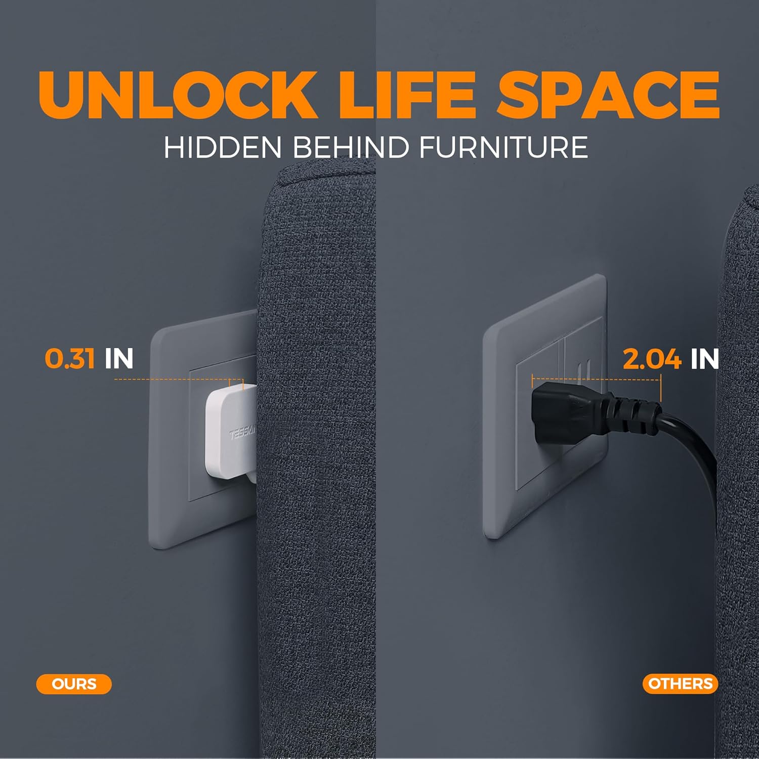 - Flat Wall Plug: With only 0.31 in ultra thin flat head design, flat power strip can easily fit in tight spots and hide behind sofa, bed, nightstand or other furniture, sitting flush against the wall; 45 degrees right angle create an extra space for other plug below without blocking