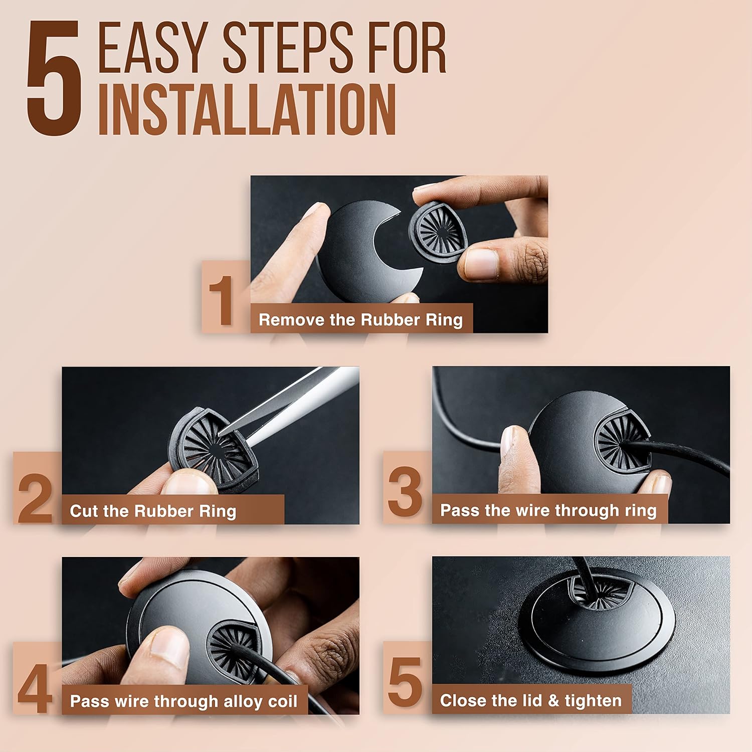 - Easy Installation: These Metal cable desk wire hole inserts are easy to install into 2 inch / 50mm hole in your desk.Simply trace outer diameter of cord grommet to drill hole and push metallic grommet in it