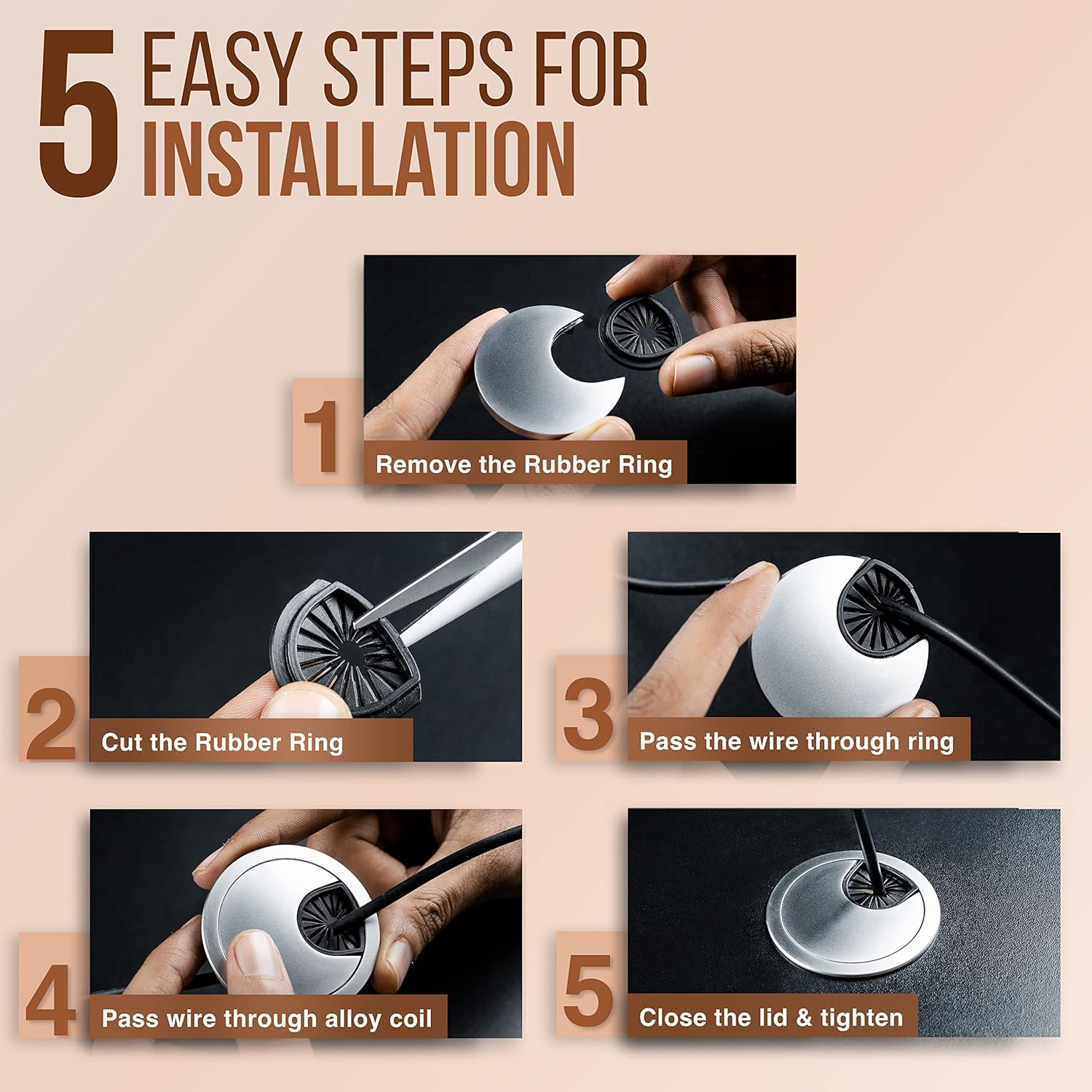 - Easy Installation: These Metal cable desk wire hole inserts are easy to install into 2 inch / 50mm hole in your desk.Simply trace outer diameter of cord grommet to drill hole and push metallic grommet in it