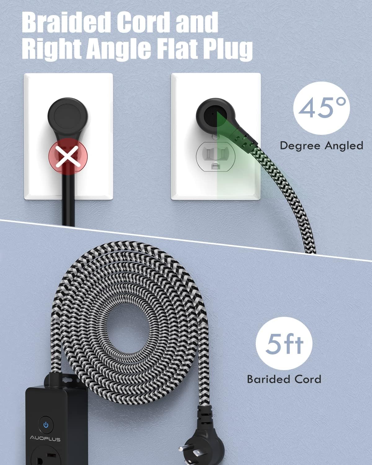 - Braided Power Cord & Flat Plug: Equipped with a right-angle flat plug for fitting in tight spaces, perfect for your nightstand. The braided power cord is not easy to deform, is durable, and safer than other power cords. The three-prong power strip flat plug takes up little space, so you can keep your desktop organized.