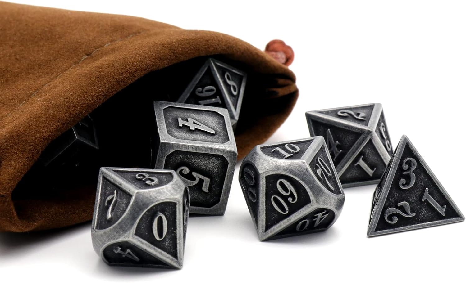 - 【7PCS DND Metal Dice】A set of metal dice has 7 pcs D4, D6, D8, D10, D12, D20 and D%. This solid metal dice are in a brown bag, not easy to lose, easy to carry. Durable and hefty metal dice for great rolling feel. You can experience the fun of the dice game with your friends.