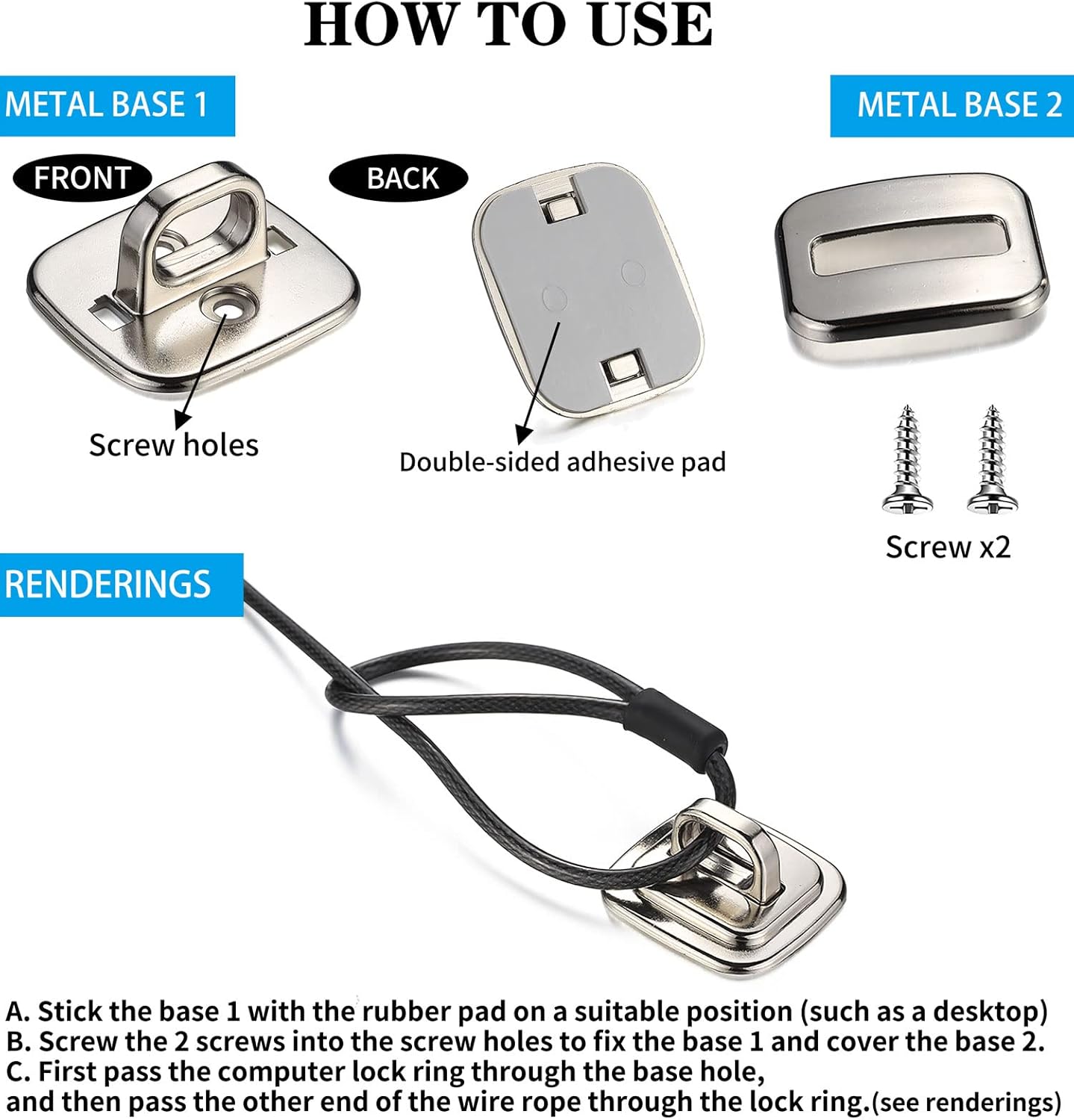 - 【Application Scenarios】The security base self-adhesive security plate is very suitable for mounting on the desktop to fix the steel cable of computer lock. Widely used in commercial and private security, including public libraries, cafes, restaurants, stores or retail outlets for point of sale, showroom displays, and much more.(steel cable not included)