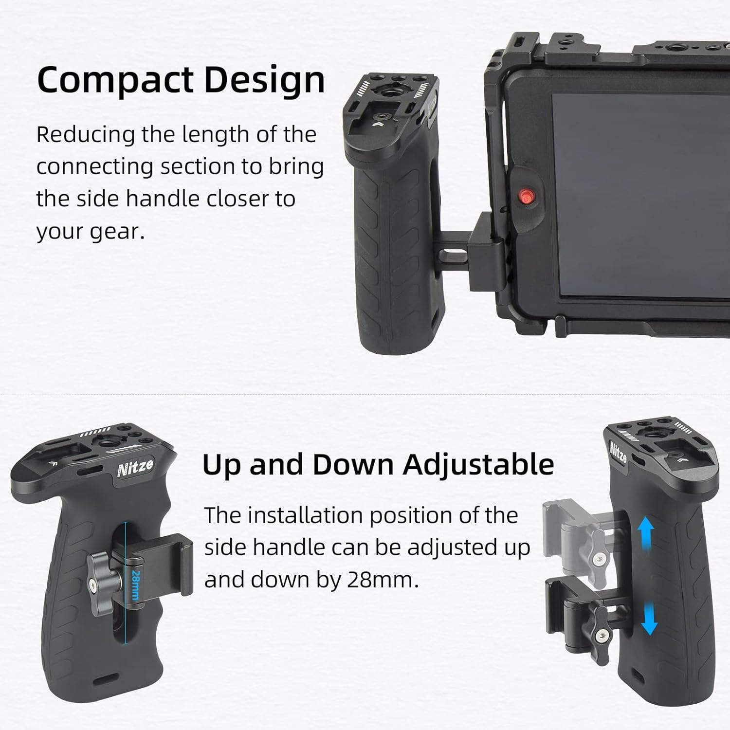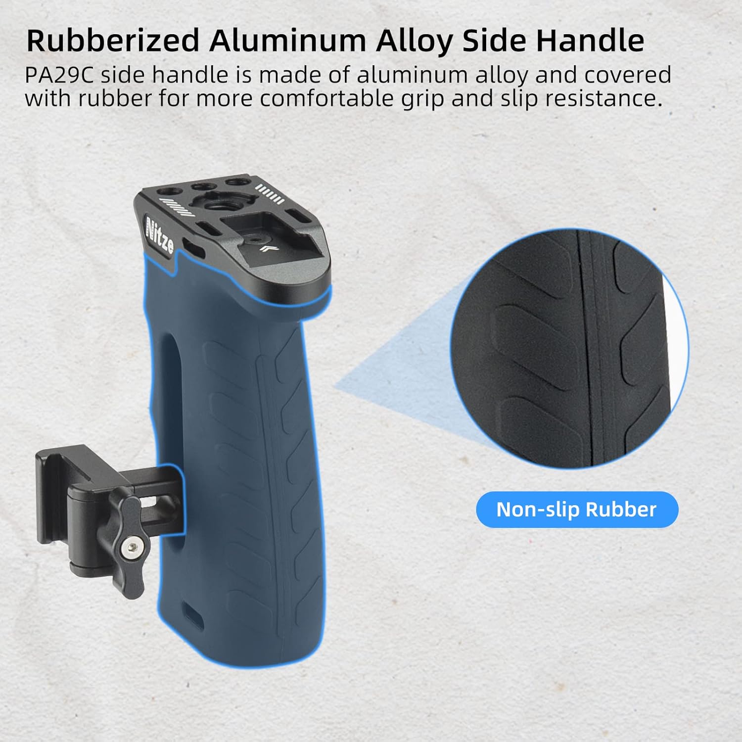 - Rubberized Aluminum Alloy Handle: Nitze PA29C side handle with NATO clamp is made of aluminum alloy and covered with rubber for more comfortable grip and durability; It can be mounted to camera or monitor cages