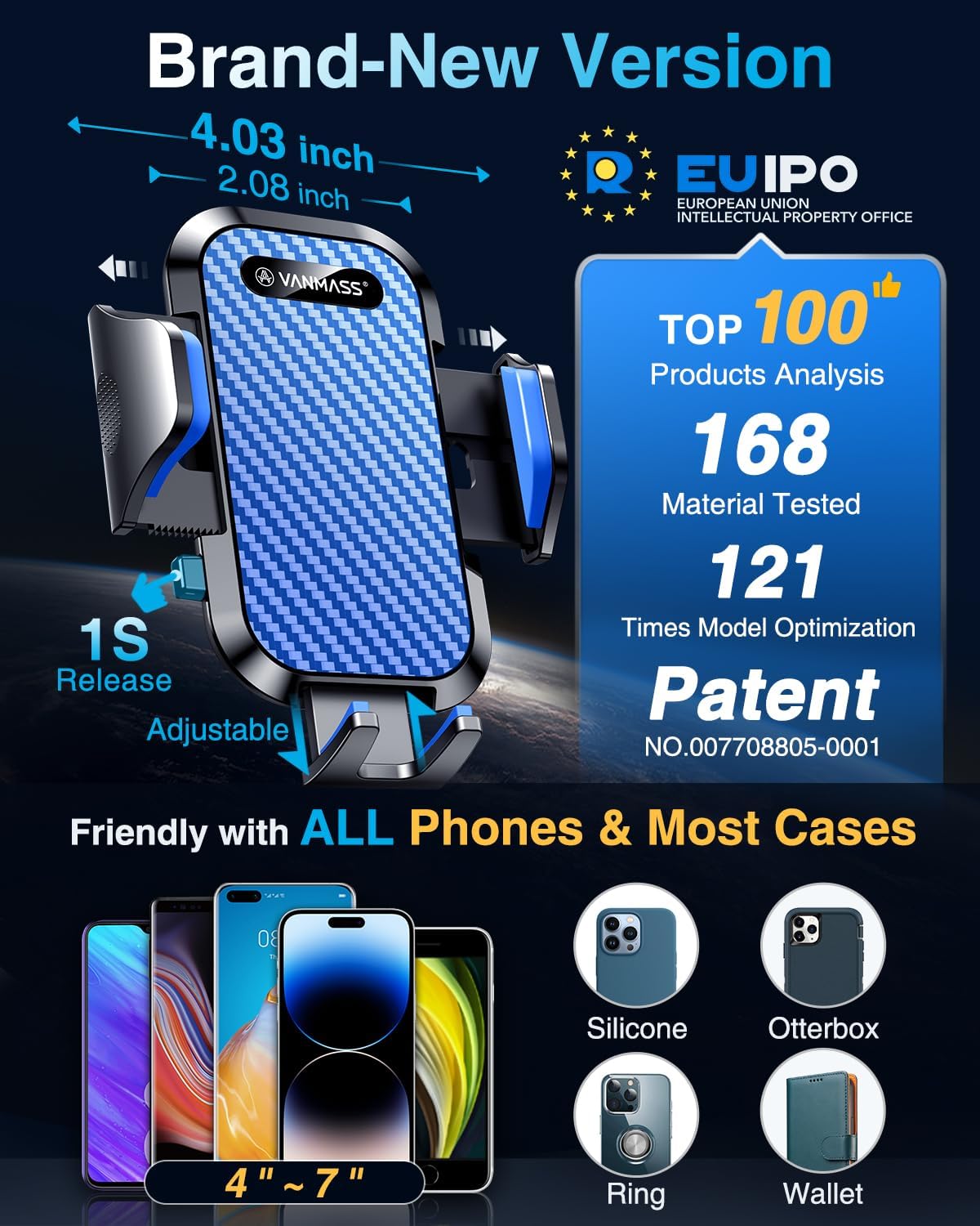 - ăBest Military-Grade Phone HolderăVANMASS's best mount with the highest rating! Preferred by 10,000,000+ Customers; Designed by world-class professional team; enjoy EUIPO Patent (No.007708805-0001), Military-grade certificate (No. GZMR220601855501), CP65/REACH/ROHS; It born based on studied 500+ holders & 500+ suction cups & 4,000+ materials; Exclusive 2 engaged gears clamp arms, 5,000+ open/close test; 10,000+ vibration resistance; 20,000+ miles road tests; -40â-194â laboratory test