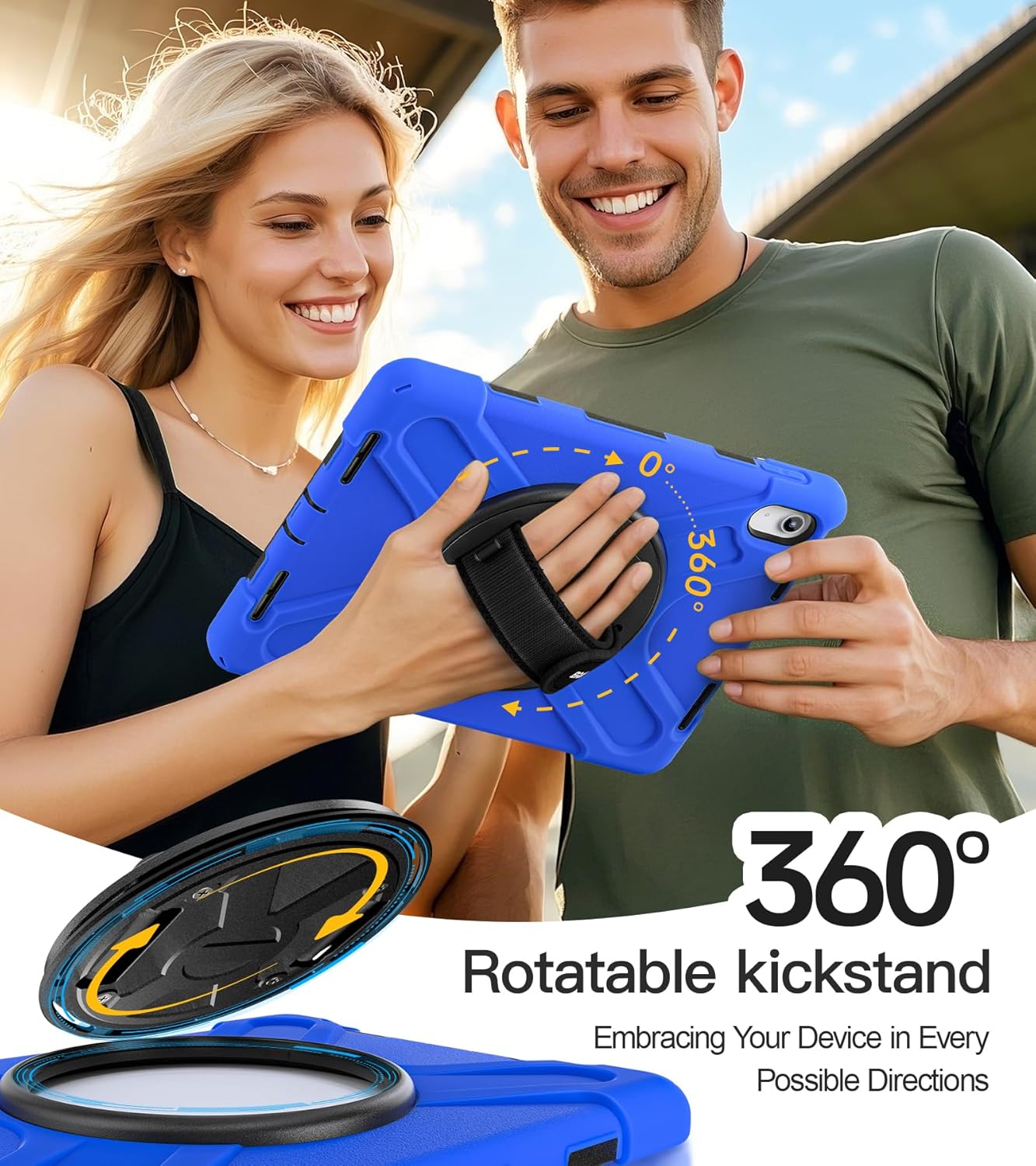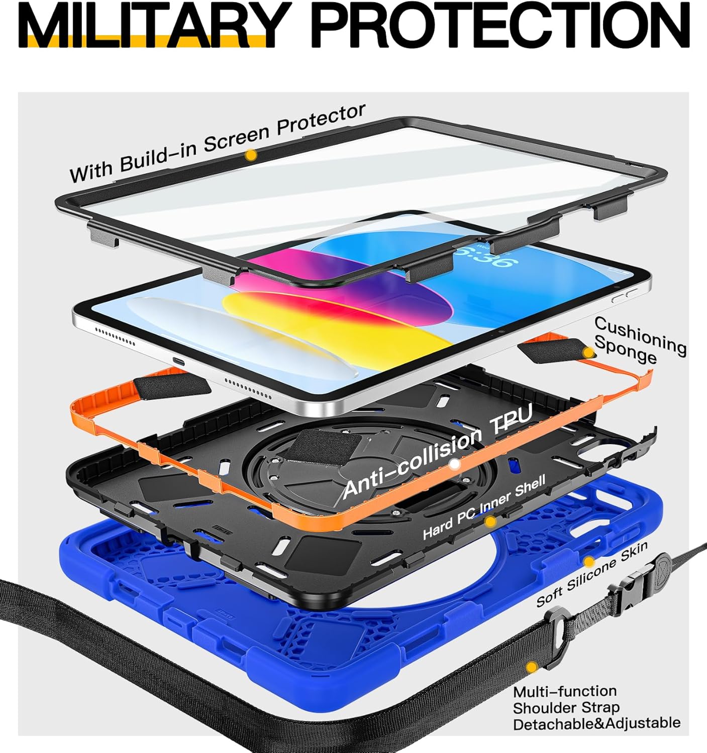 - [360°Rotating Handle/Stand & Shoulder Strap]:This ipad 11/10.9 inch case have a 360° rotation system that includes a kickstand and a hand strap, by rotating it, you can hold your ipad at any angle, by utilizing the swivel and the stand, you can support your ipad at multiple angles.The adjustable shoulder strap allows you to carry or hang your iPad at any time, so that you can provide more convenience in outdoor sports, traveling.
