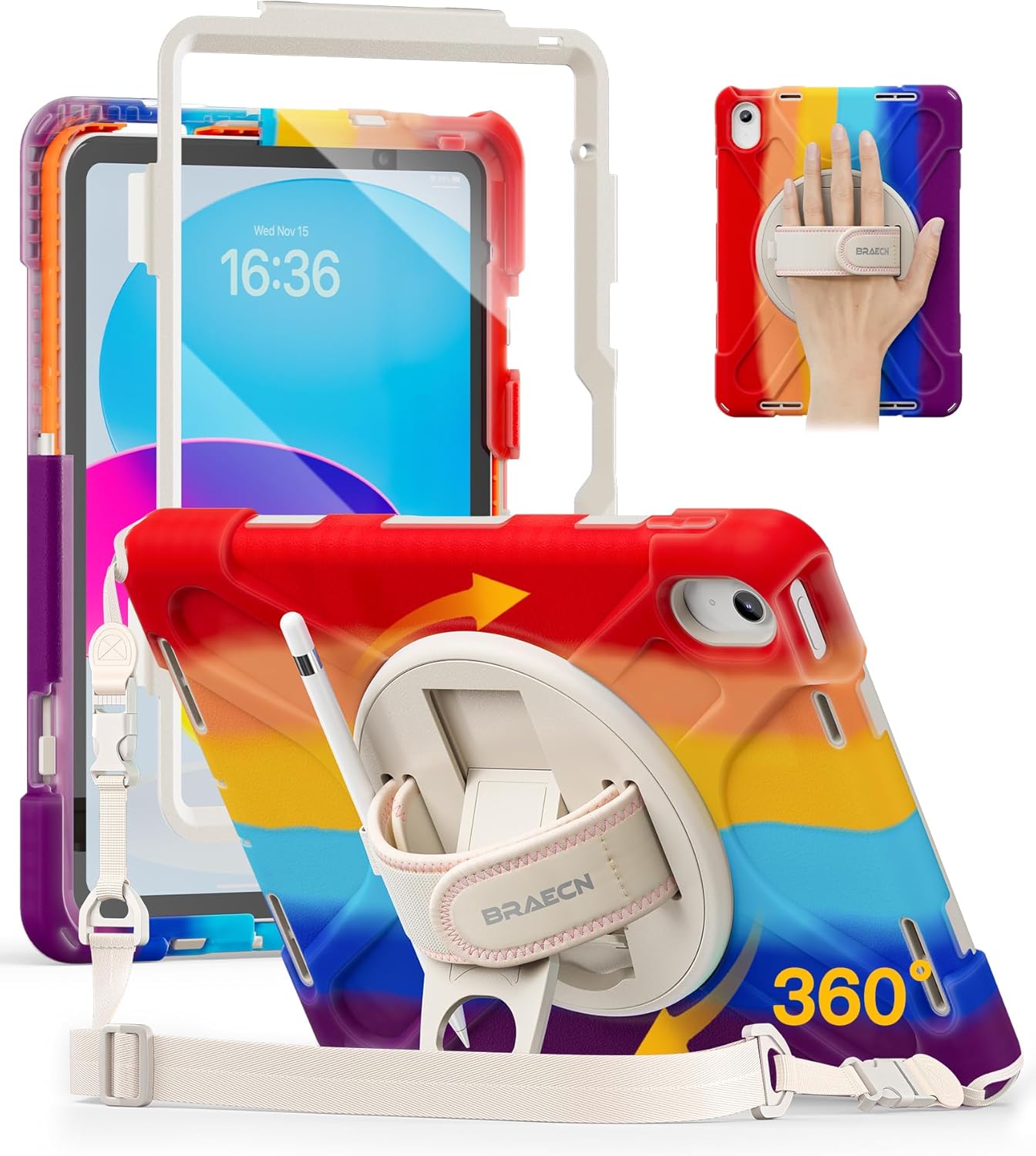 BRAECN for iPad (A16) 11th/10th Generation case 11/10.9 inch 2025/2022 Heavy Duty Shockproof Protective with Pencil Holder Screen Protector 360°Rotating Stand Handle & Shoulder Strap Full Body Cover