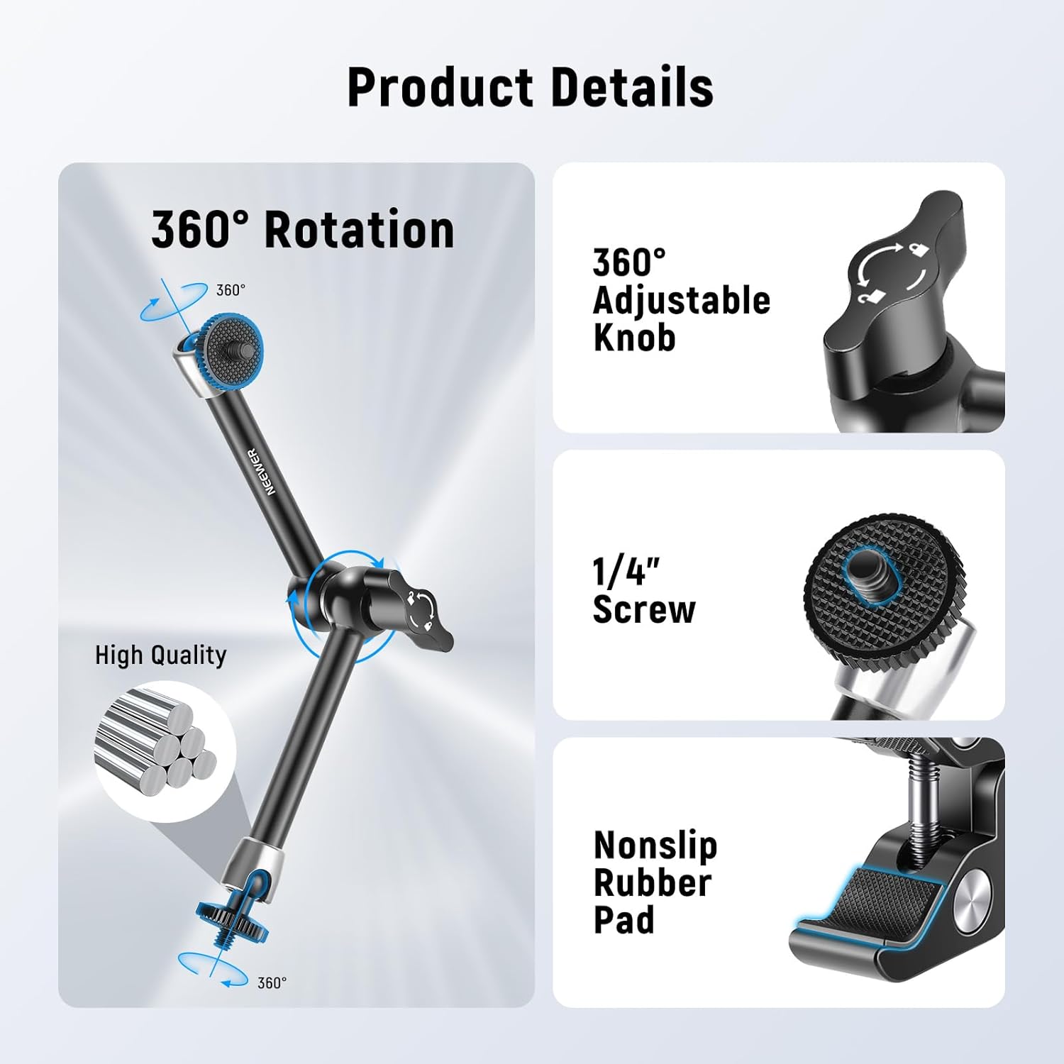 - 【Adjustable Shooting Angle】Two 360 degree ball heads of the magic arm can adjust to any angle based on your needs, providing a wide range of shooting horizons. One knob for locking all position