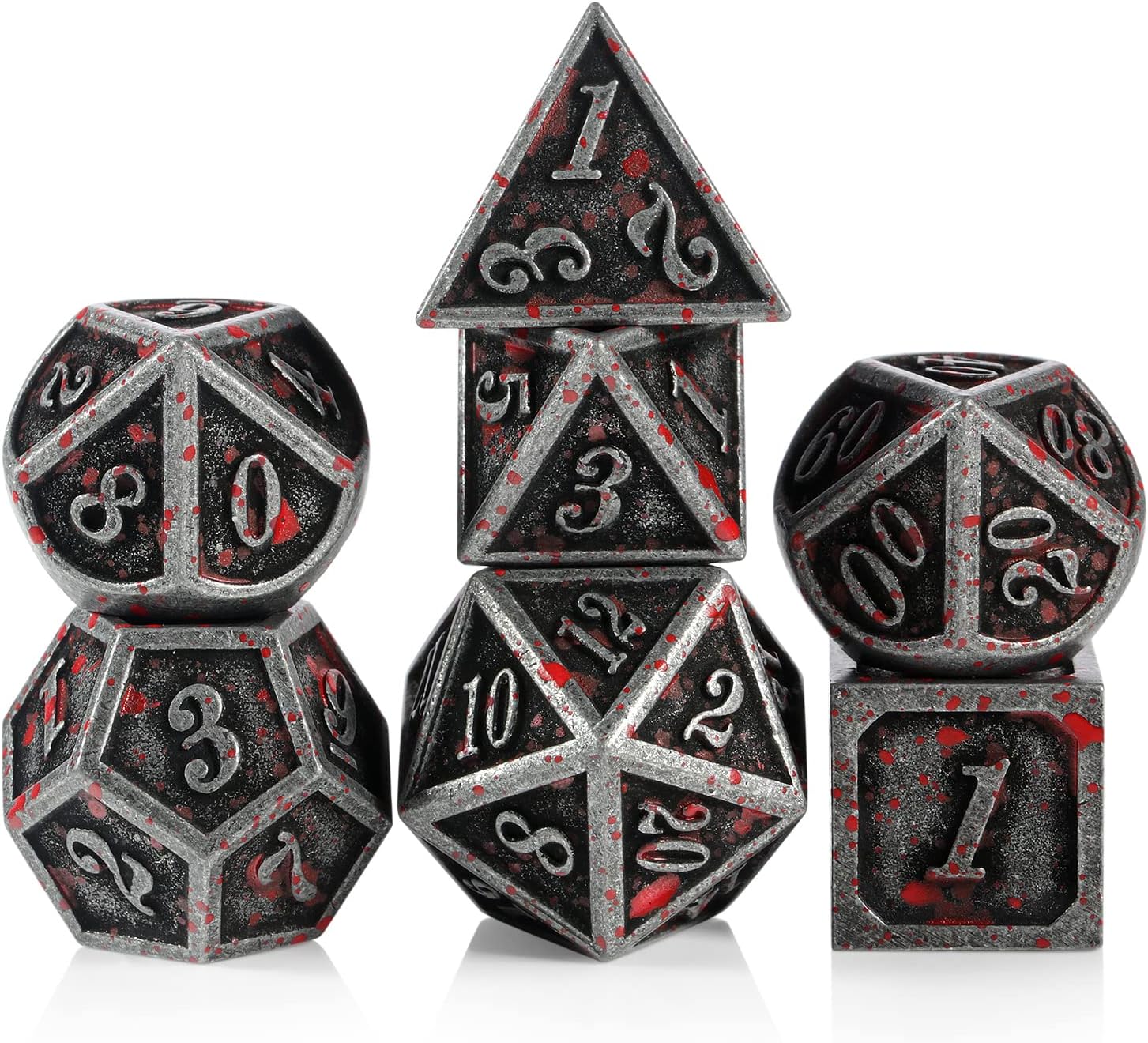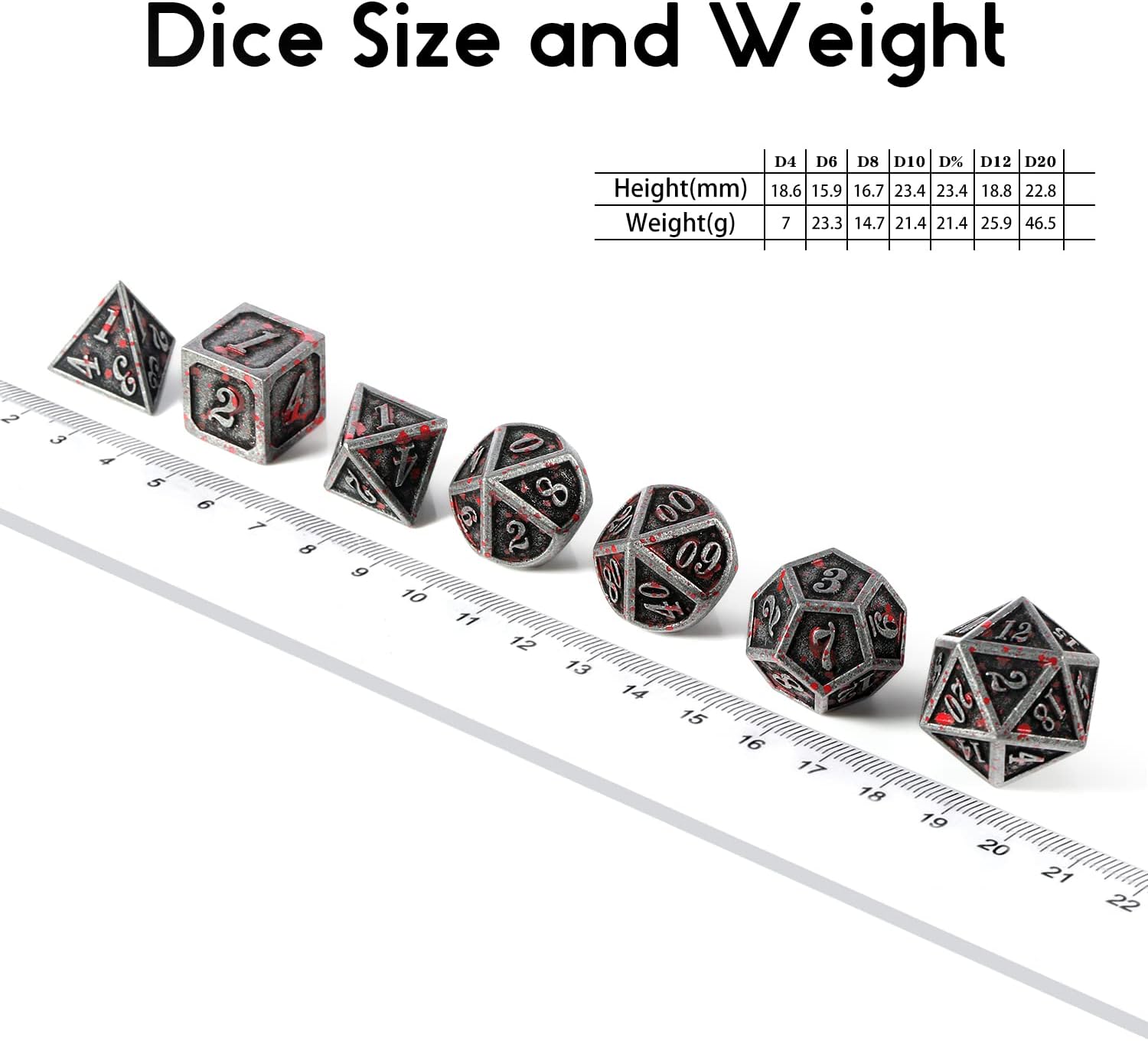 Acient Silver Bloodstained Metal Dice Set DND, DNDND 7PCS Metallic Halloween Die with Metal Case for Dungeons and Dragons Tabletop Games