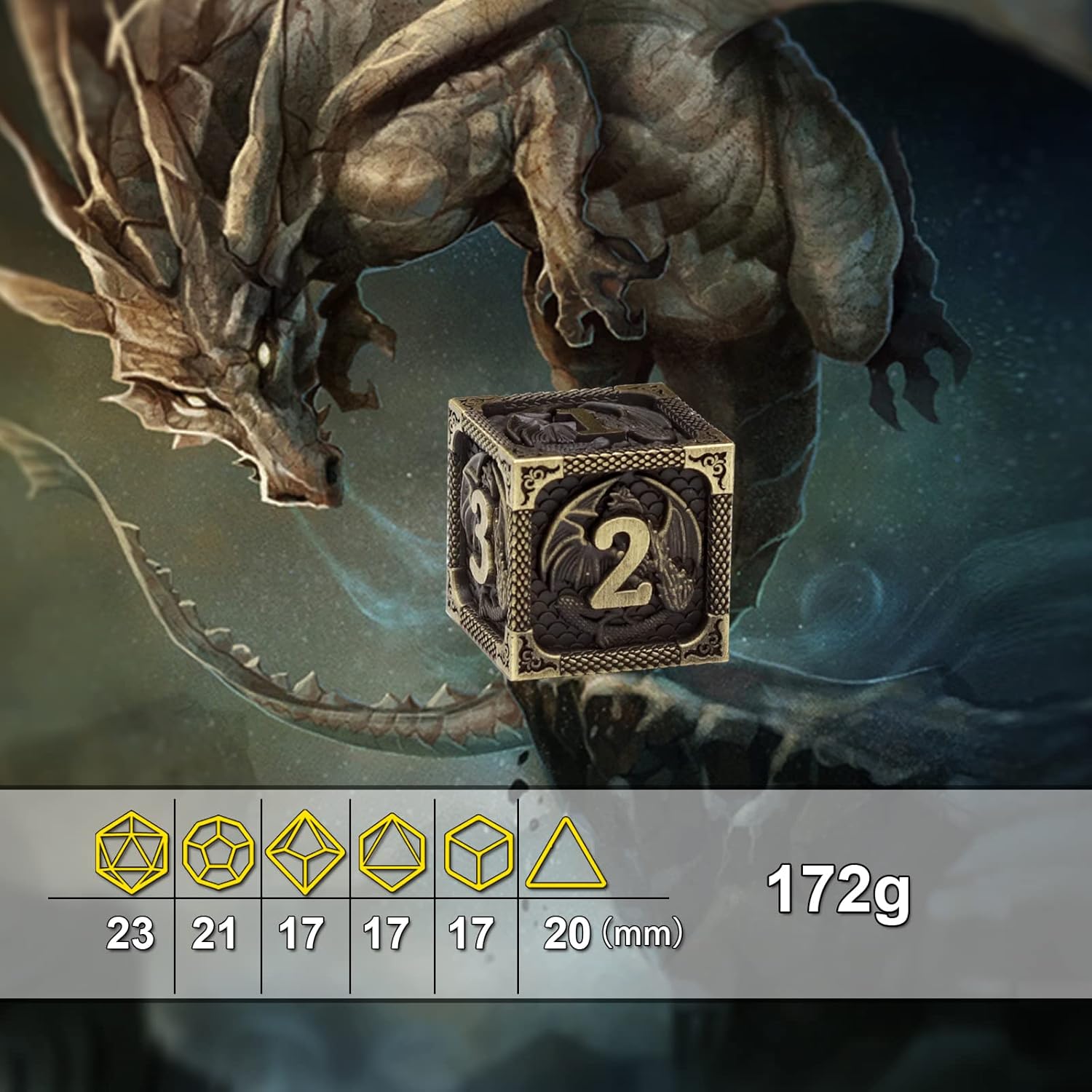 PJOY D&D Dice Set Dragon Metal DND Dice Set Antique Bronze with Case for RPG Role Playing Games Compatible with Dungeons and Dragons Gift TTRPG