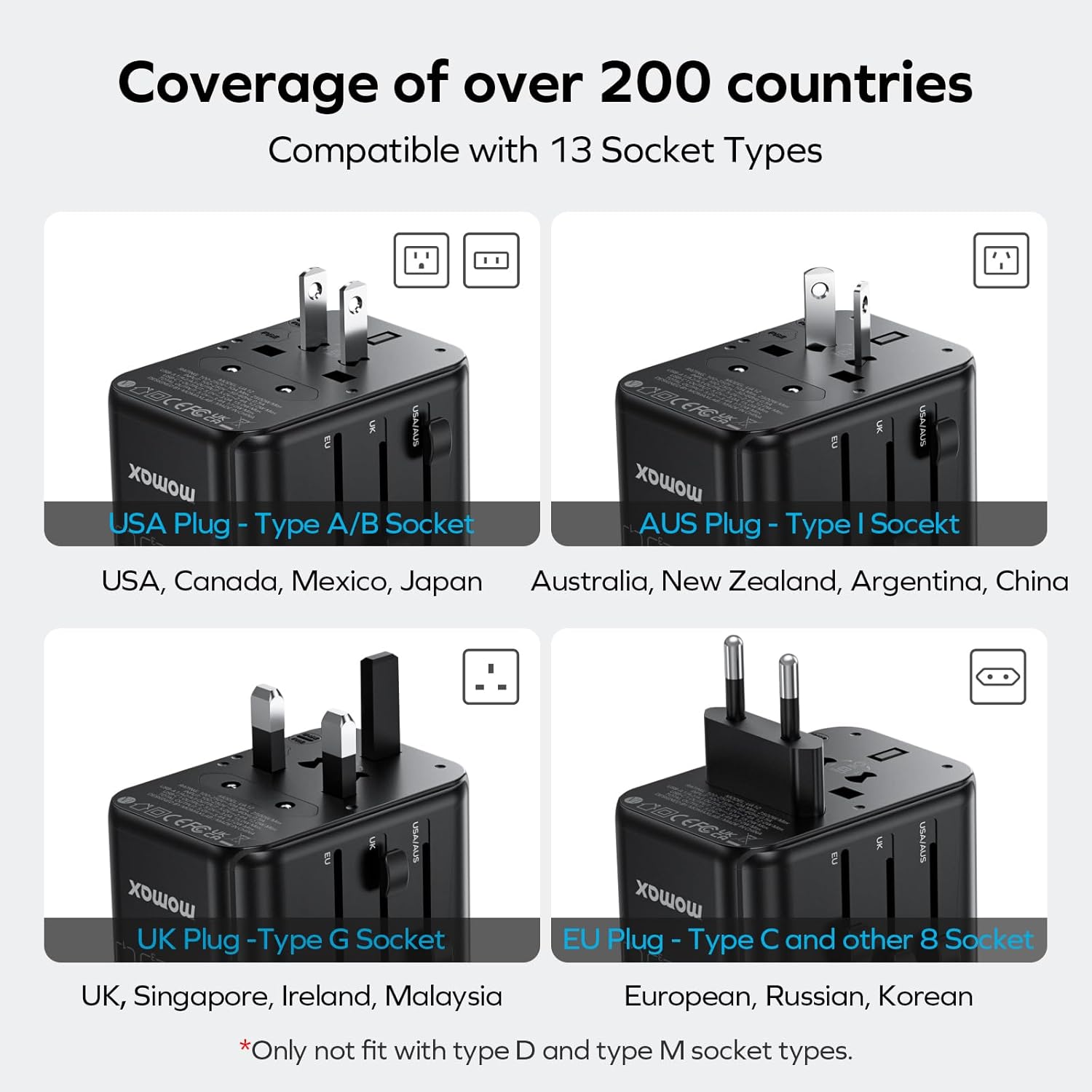 MOMAX Universal Travel Adapter, GaN 70W International Power Adapter, 3 USB-C PD Fast Charging & 2 USB-A QC, 1 AC, All-in-One International Plug Adapter for Travel European UK AUS JP