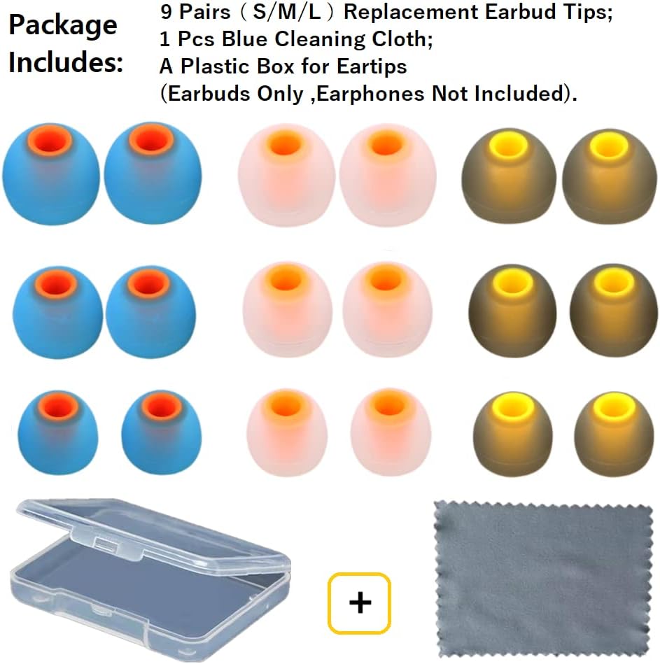- Package Includes: 9 Pairs(S/M/L)Replacement Earbud Tips;1 Pcs Blue Cleaning Cloth;A Plastic Box for Eartips(Earbuds Only ,Earphones Not Included).