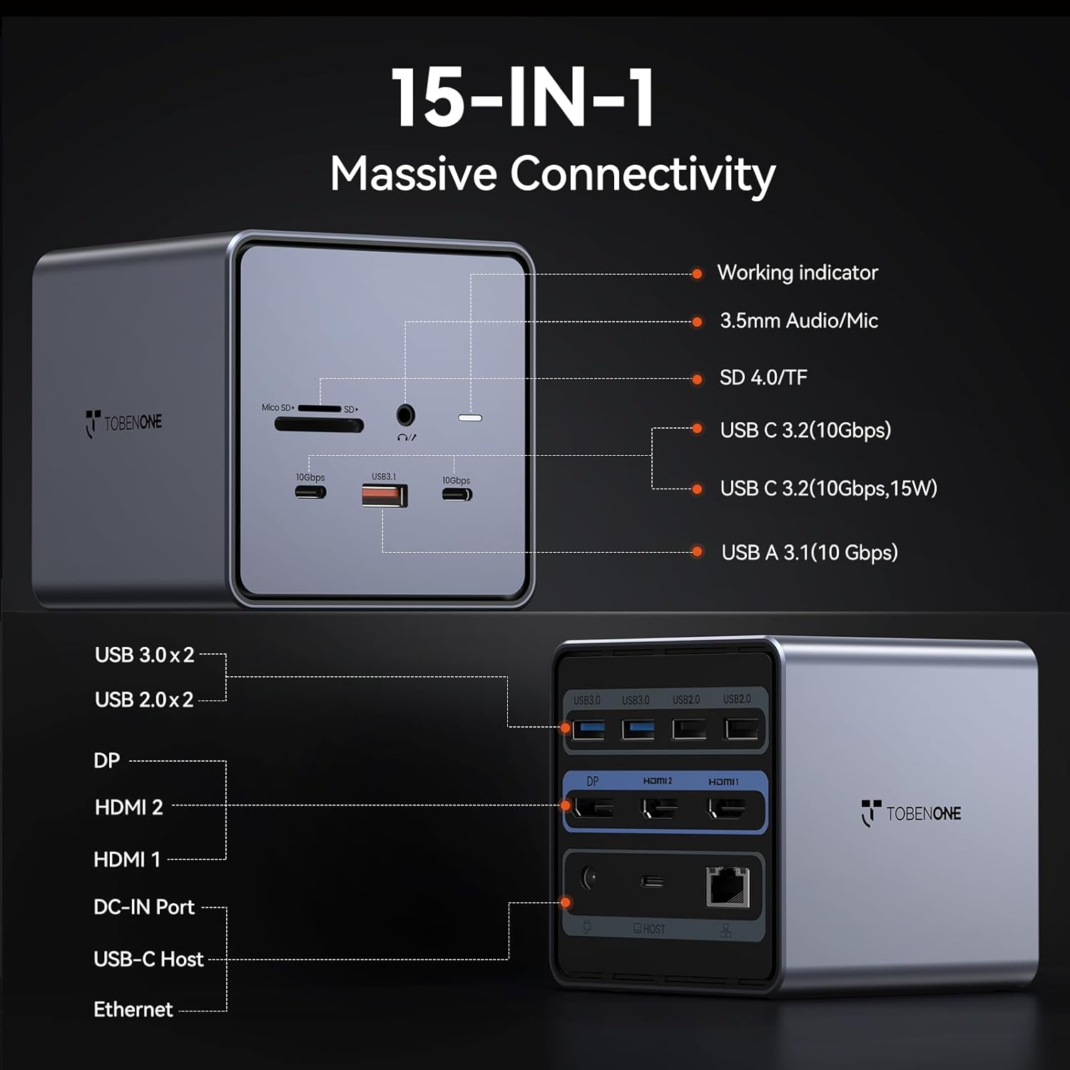 - All The Ports You Need: The docking station 3 monitors featured 15 ports, compared to other docks, more powerful and stable with the ports of connectivity. The Windows docking station is designed with 2 HDMI Ports, a DP, Gigabit Ethernet, 2 USB C 3.2 + USB 3.2 ports (10 Gbps), 2 USB 3.0 ports (5 Gbps), 2 USB 2.0 ports, DC-IN, SD/Micro SD reader, and 3.5mm Mic/Audio port