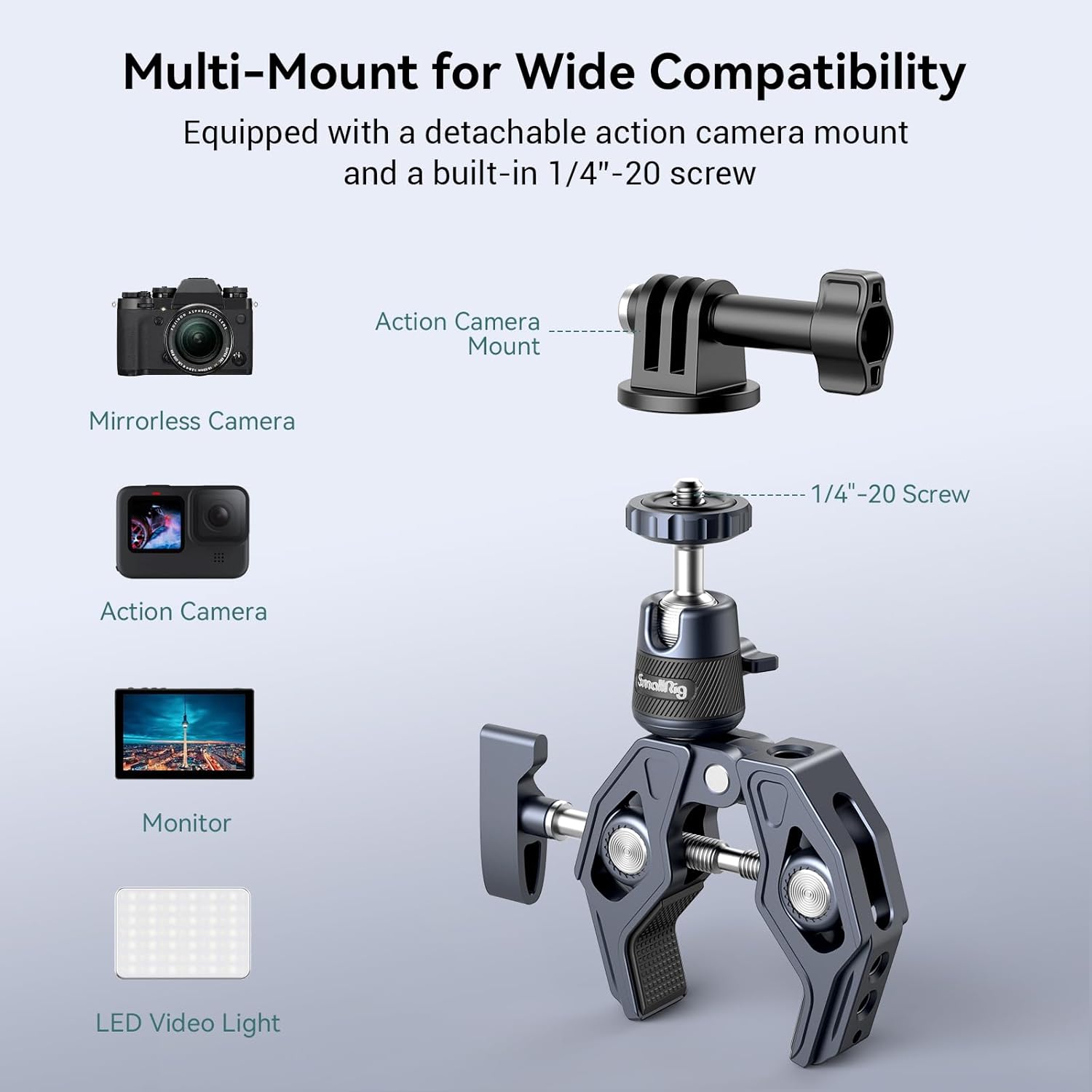 SMALLRIG Camera Mount Clamp, Gopro Motorcycle and Bike Handlebar Mount Kit, Super Clamp for DSLR, Action Camera, Gopro, Insta360, LED Light, Monitor, Max Load 3.5KG