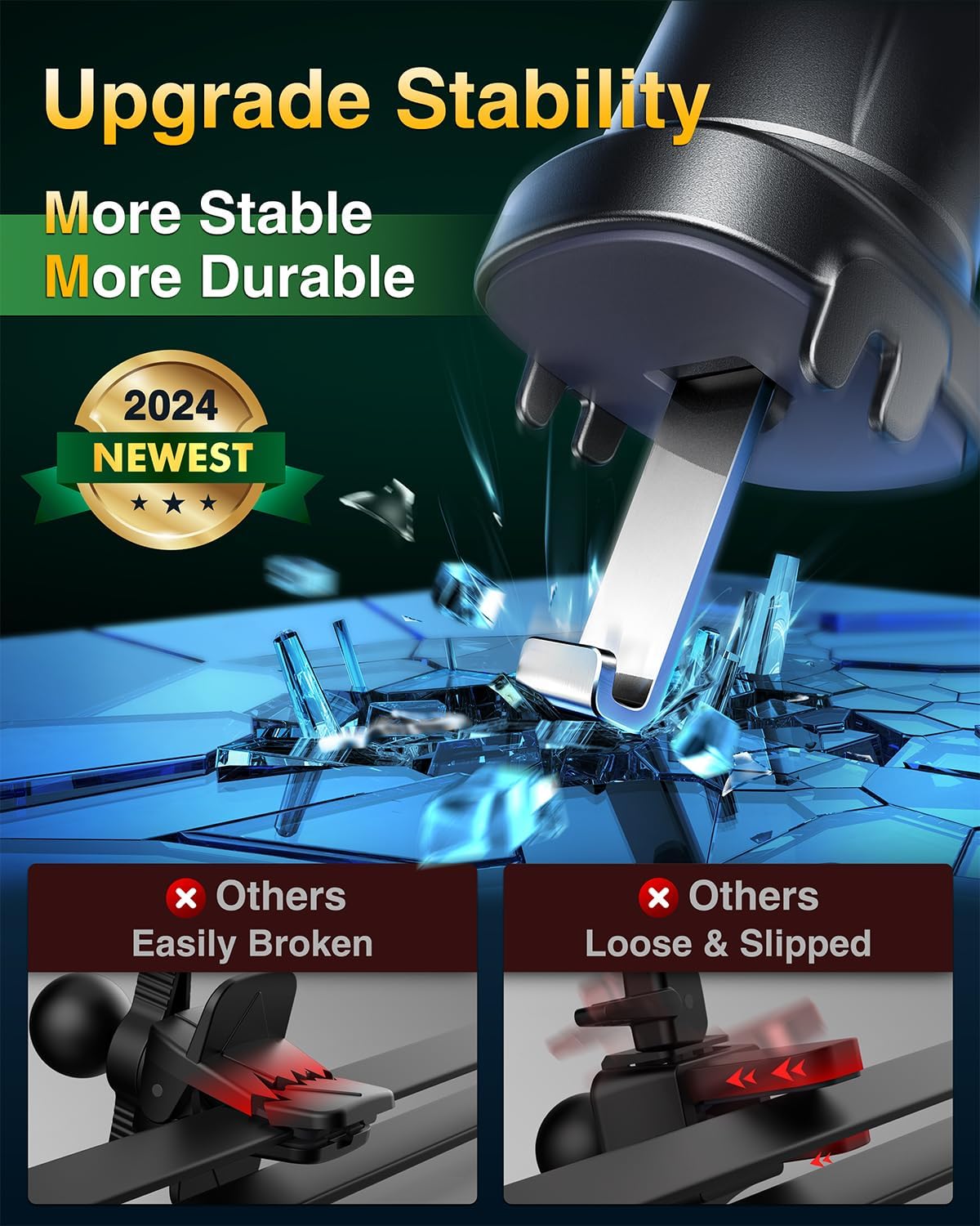 - ăNo holder better than ităWith the 2025 latest easy clamp and Metal-Cored Hook design,The four-point positioning of the phone holder for car can hold the phone stably while clamping one of the car's air outlet blades. even on a bumpy road, enabling you to drive in confidence.Low-profile mount works with most car vents.