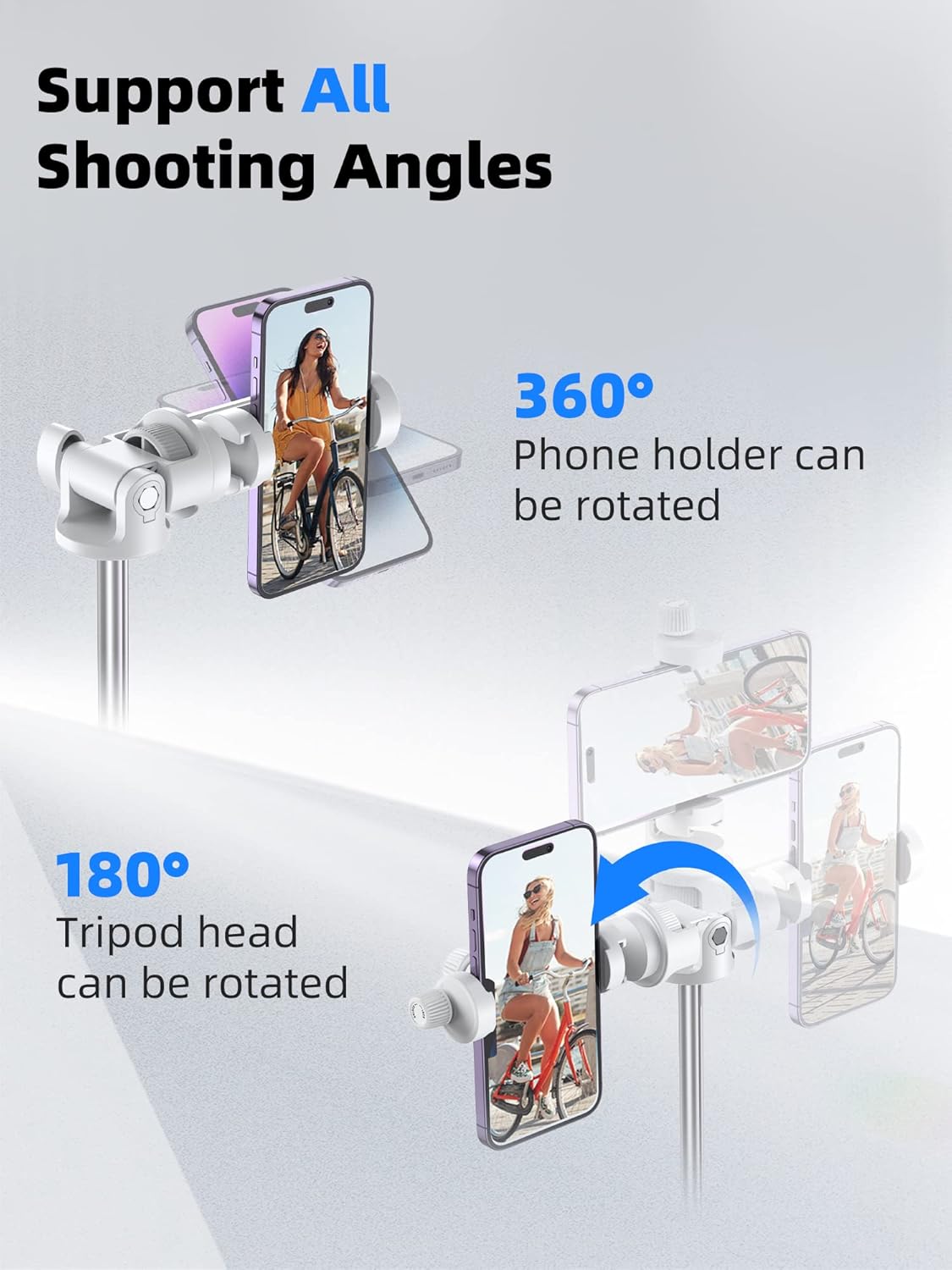 - [Support All Shooting Angles]: The tripod head is 180° rotational, and the phone holder can 360° adjust. You can set your phone freely at 720° on this phone tripod and always find the best shooting angle quickly
