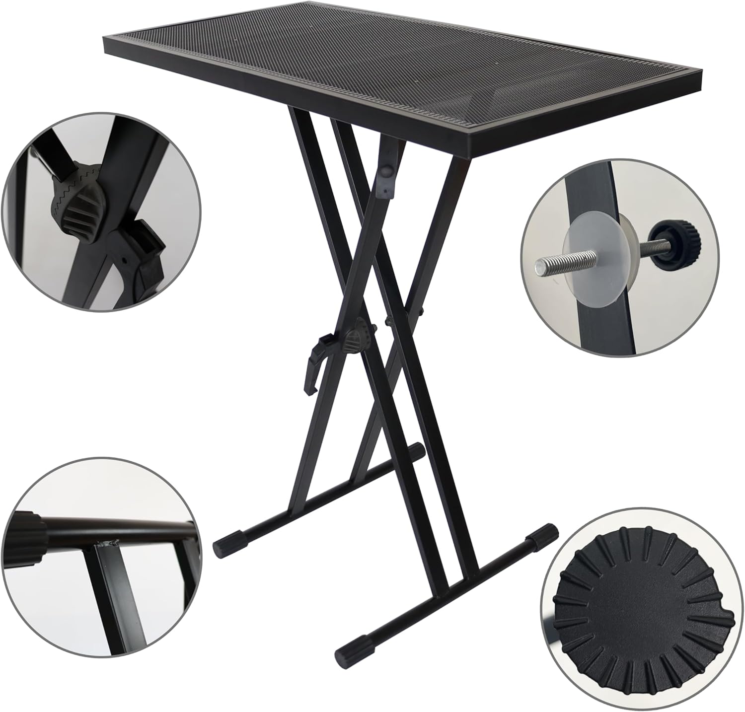 - Anti-slip rubber sleeve can be adjusted by rotation, with different thickness around, which can better cope with uneven ground, increasing the stability of the DJ Table. Note: Please put the rubber sleeve to the bottom and adjust the position to fit the tabletop. The small holes in the tabletop facilitate heat dissipation and ventilation of the device.