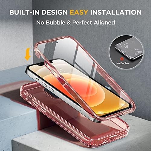 Miracase Glass Series for iPhone 12/12 Pro Case 6.1 inch, Upgraded Full-Body Rugged Phone Bumper Case Cover with Built-in 9H Tempered Glass Screen Protector and Camera Protector, Glitter Rose