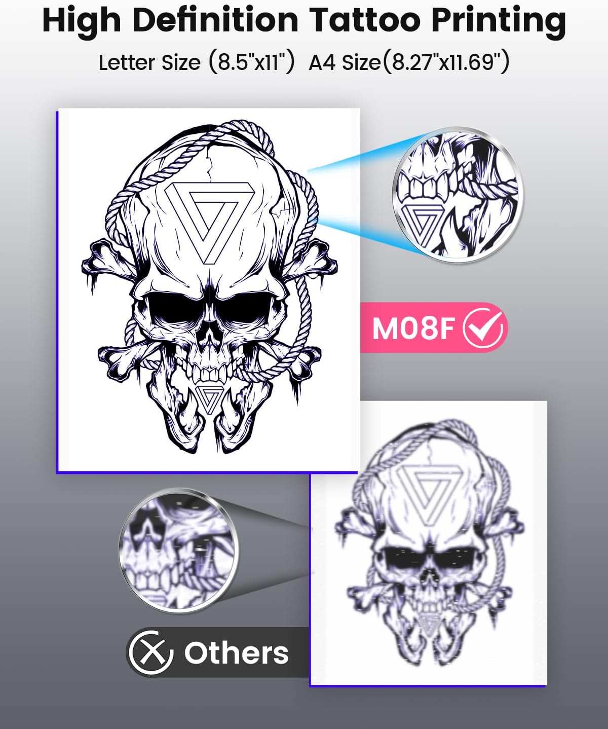 - Phomemo M08F Multi-function Printer : Not only a portable printer but also the latest tattoo stencil printer. The Phomemo tattoo stencil printer features a lightweight and wireless design, weighing just 2 pounds, which is only 60% of the size of traditional tattoo transfer machines. With its built-in rechargeable battery, you don't have to worry about being bound by charging cables, providing unparalleled convenience and ease-of-use for on-the-go professionals and tattoo artists