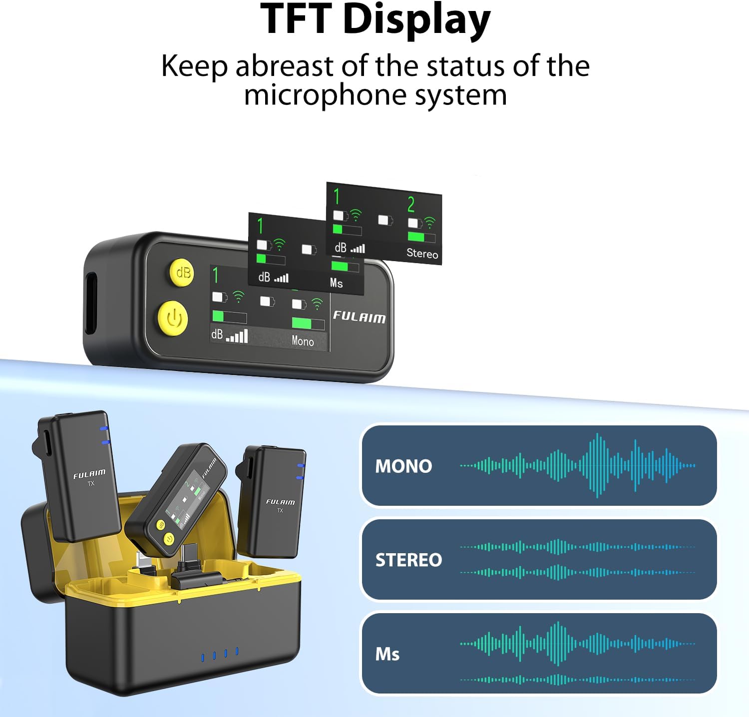 - Real-Time Monitoring: The receiver has a 3.5mm real-time monitoring port and a TFT screen, which allows you to monitor the recording sound, see the volume, connection status, and audio mode directly, ensuring you have complete control over your recording. The microphone has three audio input modes: stereo, mono, and secure audio track, giving you the flexibility to choose the best audio input mode for your recording needs.