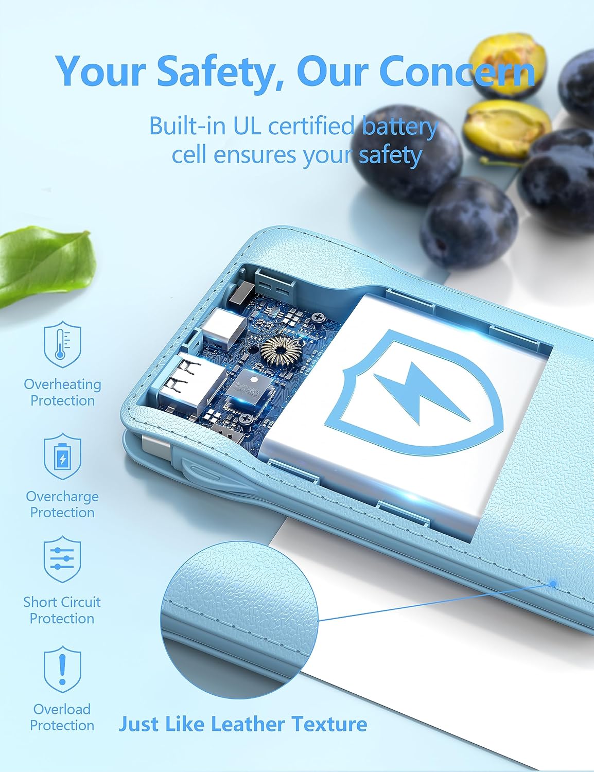 10000mAh Portable Phone Charger with Built-in 2 Cables, Small Slim Mini Power Bank Fast Charging, USB-C In/Output External Battery Pack, Travel Essentials Compatible with Android/IOS Phones