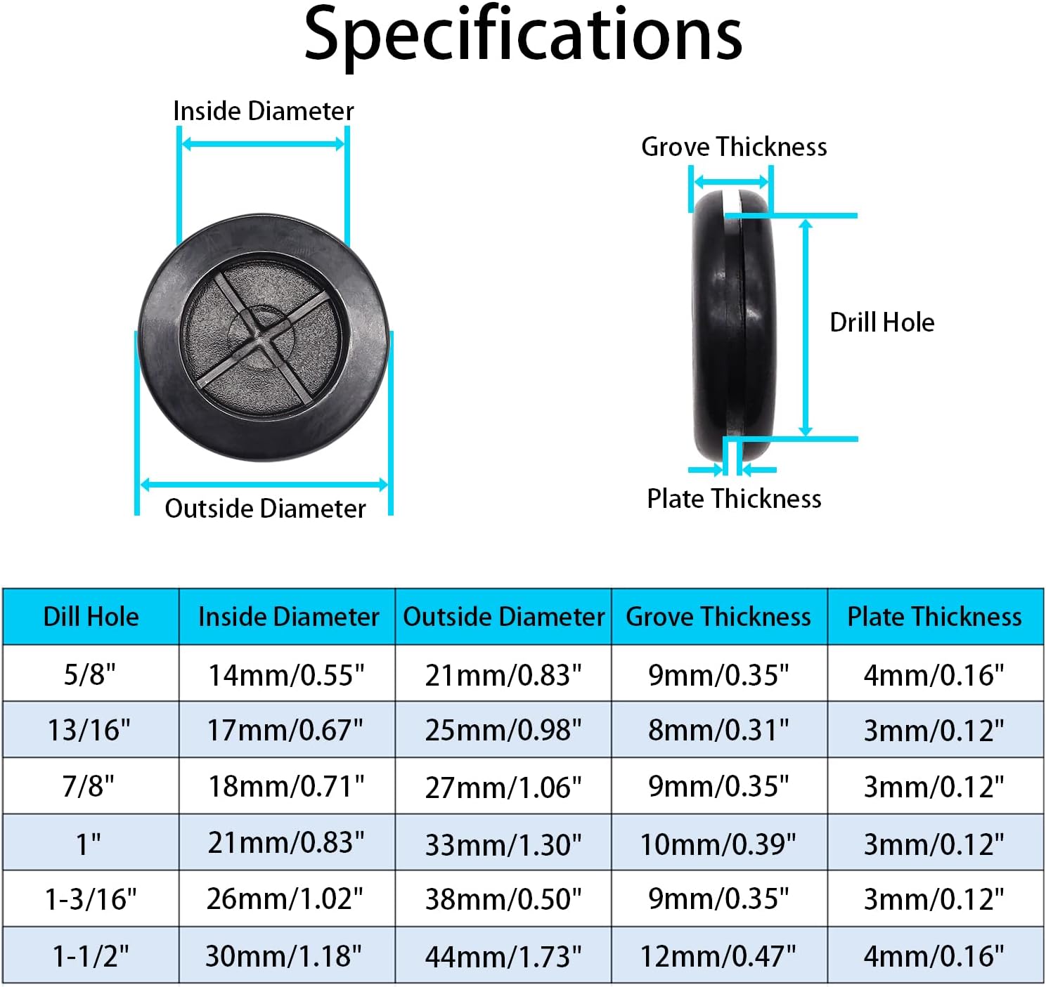 - Product include: Our rubber grommet assortment kit comes in 6 different sizes, 53pcs (4pcs 1-1/2",12pcs 5/8",8pcs 1-3/16",8pcs 1",10pcs 7/8",11pcs 13/16") with a knife.