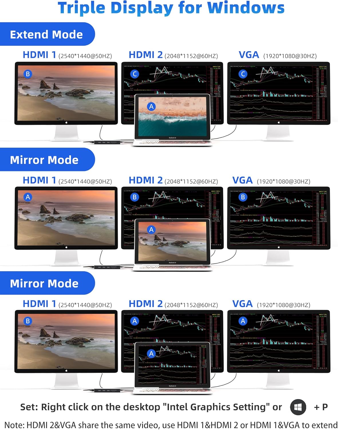 - MST EXTEND TRIPLE DISPLAY FOR MAC OS & WINDOWS: Made of the latest smart chip, just need to download the drivers (free), the docking can break the single-stream limitation of macOS. Mosirui USB Docking Station provides mirror mode (SST) and extended mode (MST) for both macOS & Windows systems, which is perfect for picture editing, online teaching, video chatting, and so on. Note: HDMI 2 and VGA share the same video, please use HDMI 1 and HDMI 2 or HDMI 1 and VGA to extend 2 monitors.
