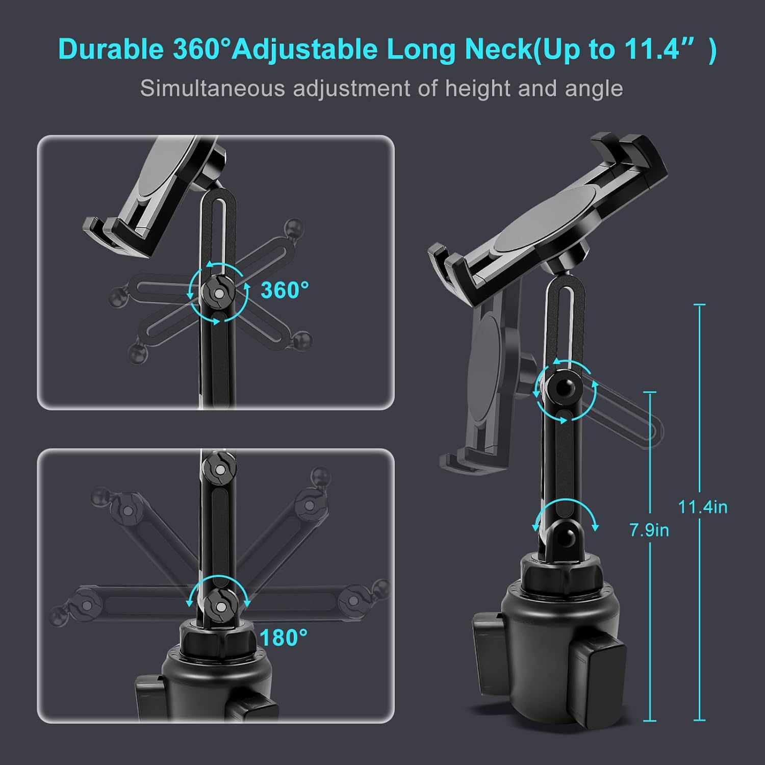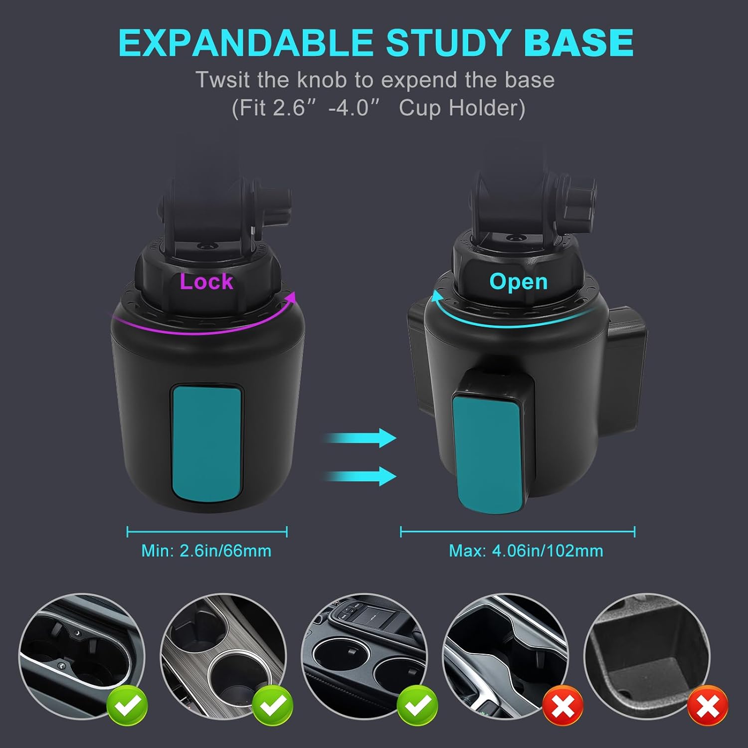 - 【UPGRADED EXPANDABLE SOLID BASE】The upgraded adjustable base of this cup holder tablet mount can be extended from 2.6 to 4.0 inches (66-100mm), adapts to most round cup holders. Meanwhile, the heavy-duty base is designed with three non-slip silicone extensions, forming a triangular stable structure, the cup tablet holder will be securely locked in your cup holder, makes it easy for map-viewing, phone calls and hassle-free charging, suitable for most cars, vehicles, SUV, trucks, boats, etc.