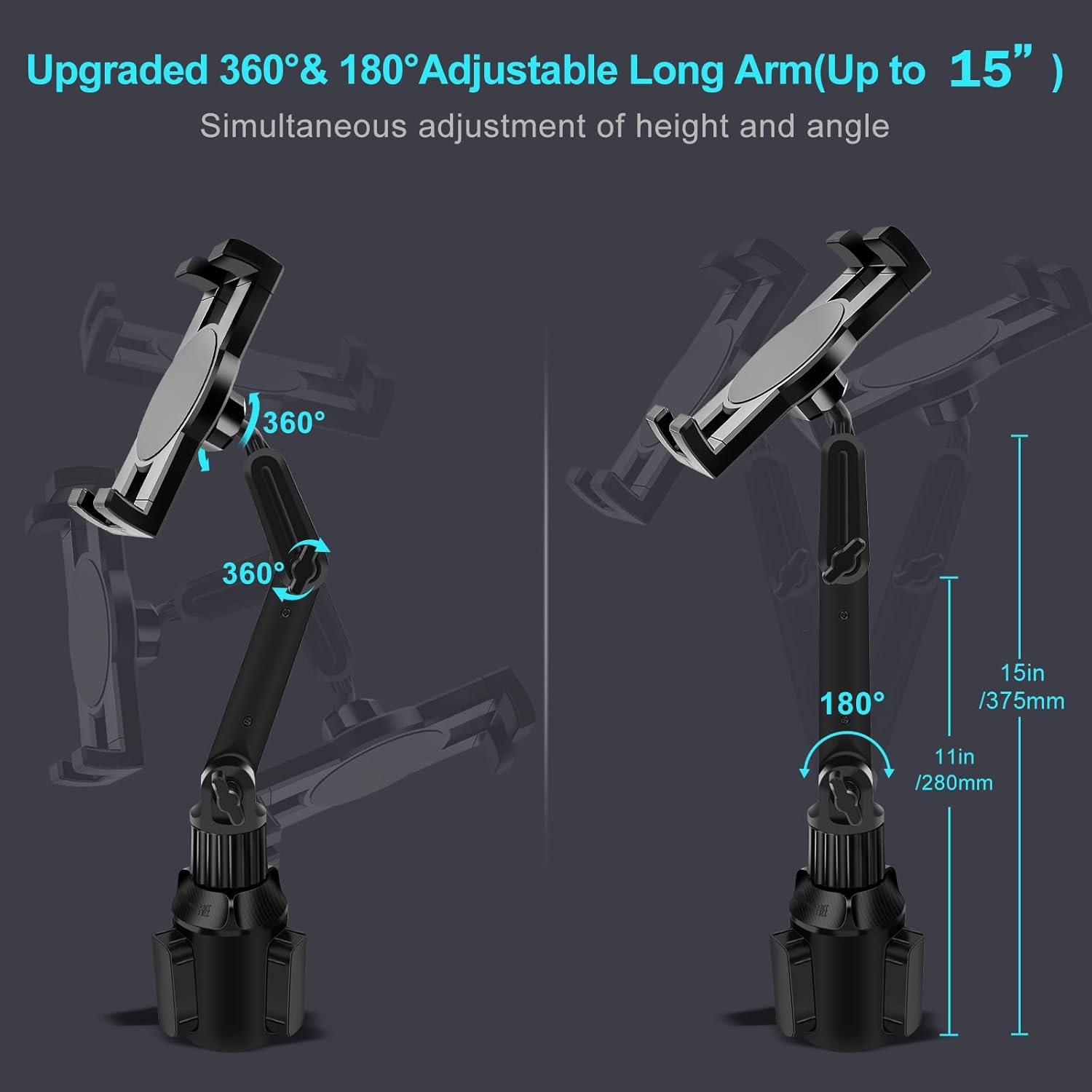 Cup Holder Car Tablet Mount for Truck, 360° Adjustable 15" Long 2-Arm Stand Holder for iPad Pro 12.9/11/10.5/9.7/Air/Mini 6/5/4, Samsung Galaxy Tab/Z Fold 6/5/4, iPhone 16/15/Pro, 4.7-12.9" Tab &Phone