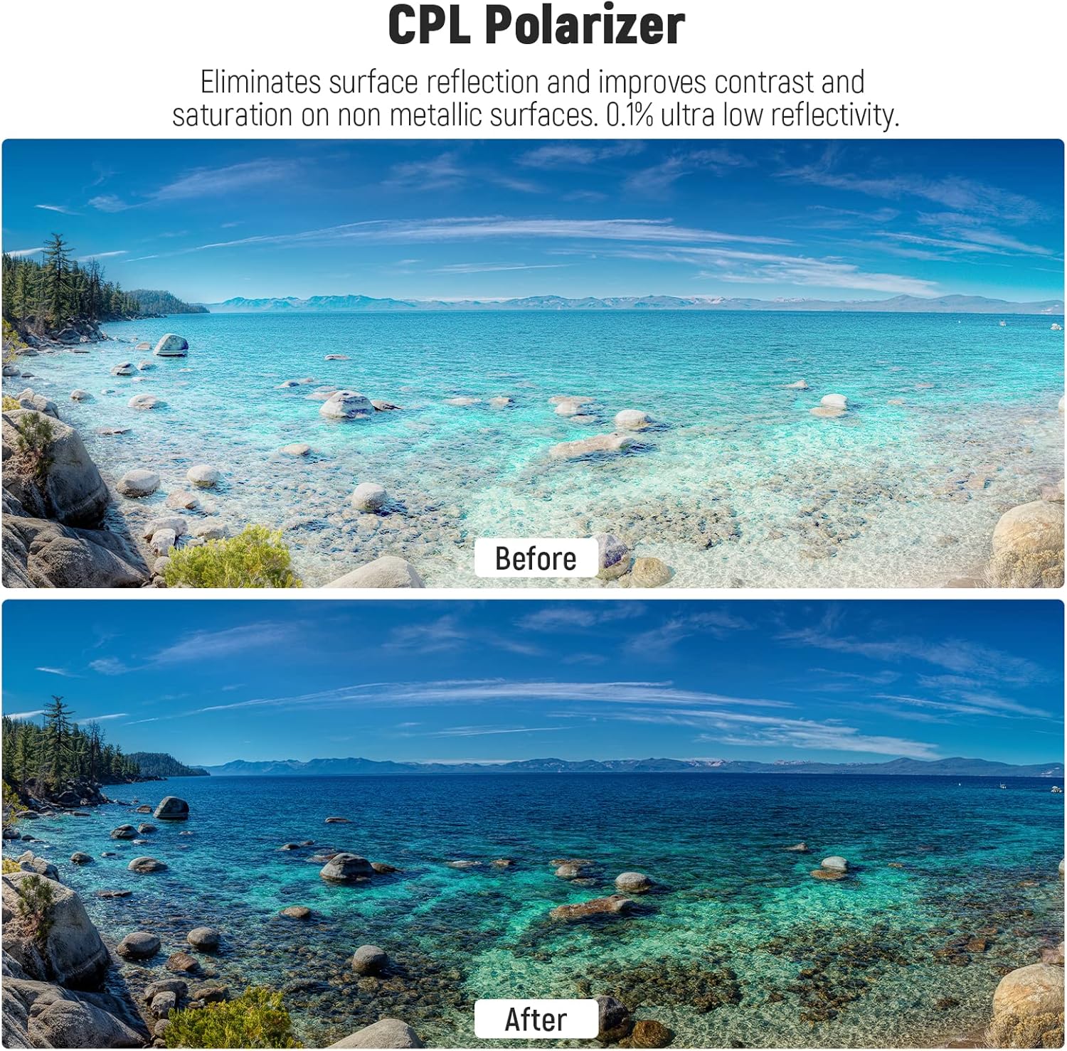 - 【Reduces Glare/Enhances Color】 The circular polarizing filter effectively minimizes reflections and glare from glass, water, and other nonmetallic surfaces while boosting image saturation and contrast for vibrant shots