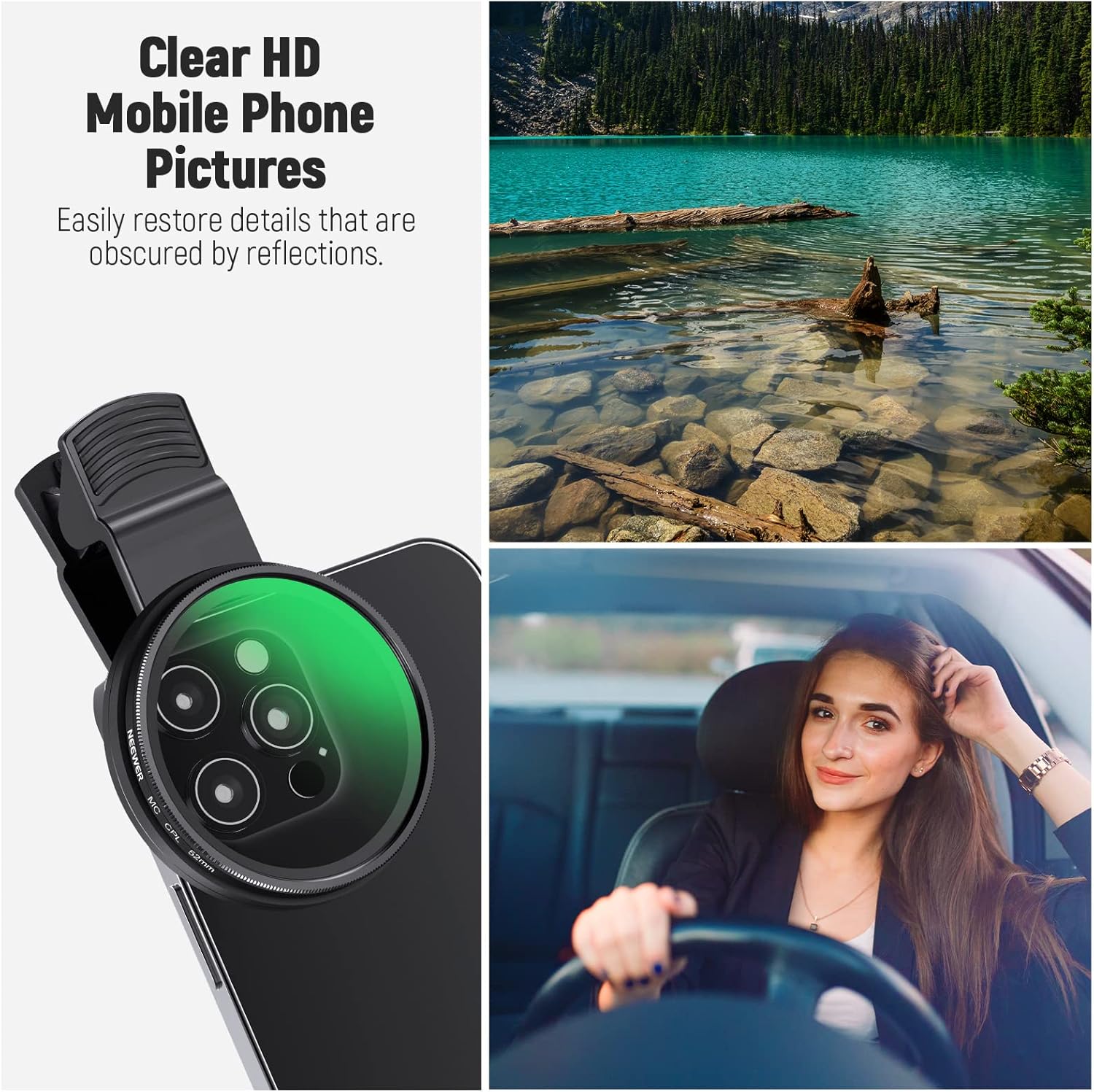 NEEWER 52mm CPL Filter for Phone, Clip On Circular Polarizing Lens Filter with Phone Clip, Storage Case & Cleaning Cloth, Compatible with iPhone Samsung Galaxy Android DSLR Camera, FL-26
