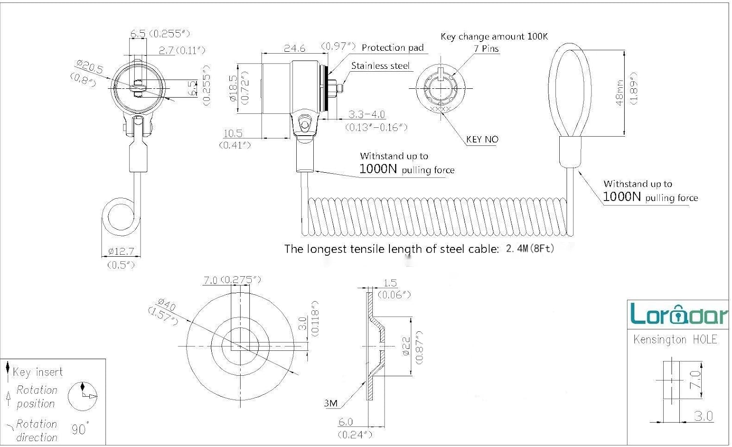 - 【Self-rolling cable】 The maximum stretching length can reach 2400mm (8ft) Anchor plate with strong adhesive, please wipe the sticking area clean before use, static pressure for 3-5 minutes, maximum pressure of 60lb after 48 hours The cable connector can withstand the maximum 1100N tensile test. This lock is exquisite and compact, with military quality, easy to carry and save space